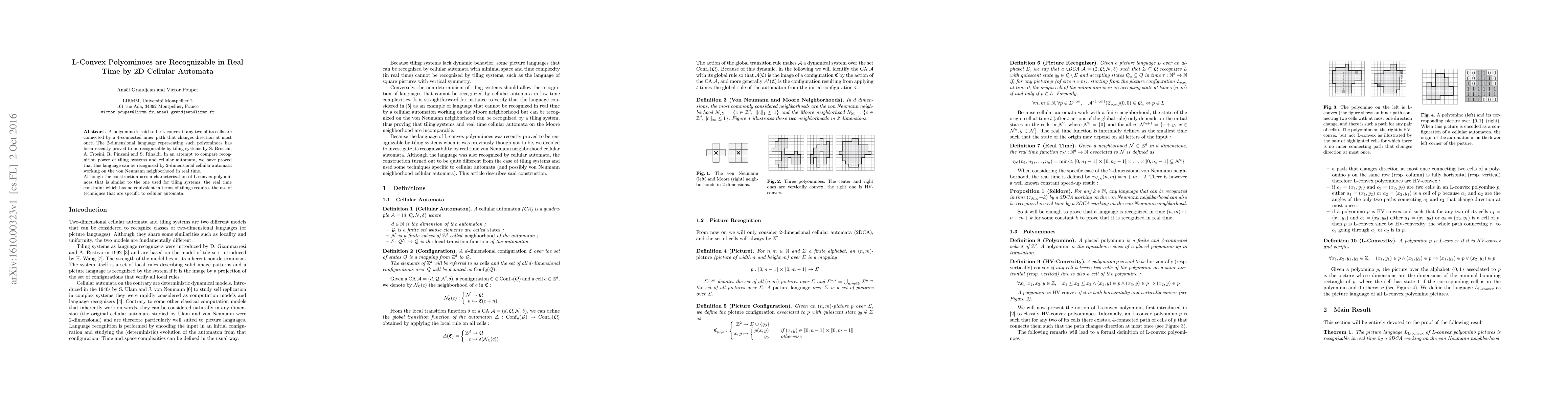 This paper demonstrates that L-convex polyominoes, characterized by a specific 4-connected inner path, can be recognized in real time by 2D cellular automata, contrasting with previous recognition methods using tiling systems. The real-time constraint necessitates unique cellular automata techniques.