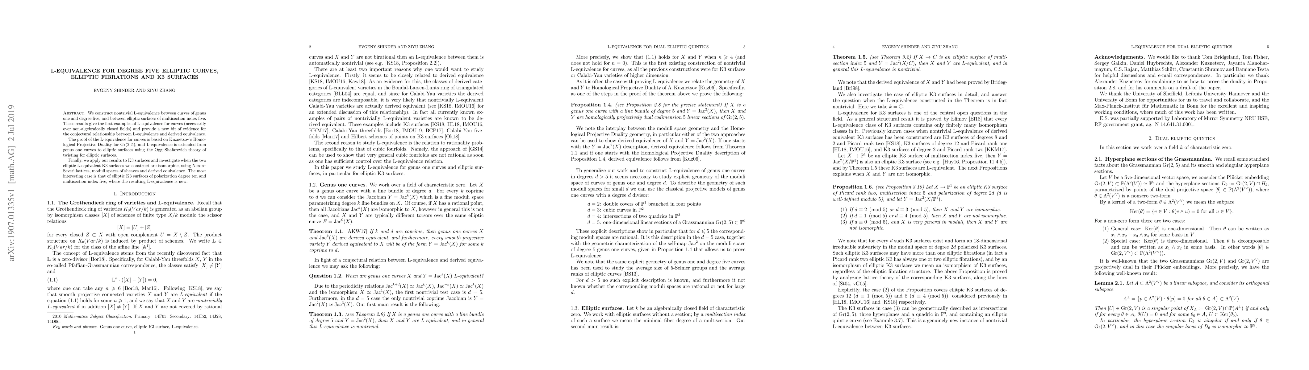 This paper constructs L-equivalence between degree five elliptic curves and elliptic surfaces, providing the first examples over non-algebraically closed fields. It applies Kuznetsov's duality and Ogg-Shafarevich theory to extend L-equivalence and examines elliptic K3 surfaces, revealing new L-equivalence for those of polarization degree ten and multisection index five.