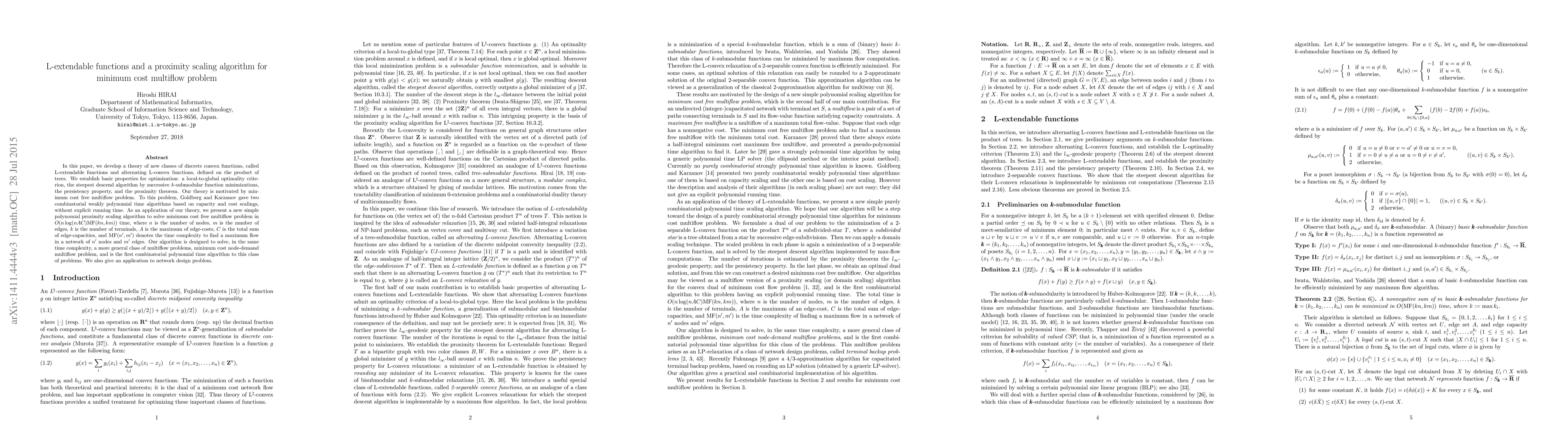 In this paper, we develop a theory of new classes of discrete convex functions, called L-extendable functions and alternating L-convex functions, defined on the product of trees. We establish basic properties for optimization: a local-to-global optimality criterion, the steepest descend algorithm by successive $k$-submodular function minimizations, the persistency property, and the proximity theorem. Our theory is motivated by minimum cost free multiflow problem. To this problem, Goldberg and Karzanov gave two combinatorial weakly polynomial time algorithms based on capacity and cost scalings, without explicit running time. As an application of our theory, we present a new simple polynomial proximity scaling algorithm to solve minimum cost free multiflow problem in $O(n \log (n AC) {\rm MF}(kn, km))$ time, where $n$ is the number of nodes, $m$ is the number of edges, $k$ is the number of terminals, $A$ is the maximum of edge-costs, $C$ is the total sum of edge-capacities, and ${\rm MF}(n',m')$ denotes the time complexity to find a maximum flow in a network of $n'$ nodes and $m'$ edges. Our algorithm is designed to solve, in the same time complexity, a more general class of multiflow problems, minimum cost node-demand multiflow problem, and is the first combinatorial polynomial time algorithm to this class of problems. We also give an application to network design problem.