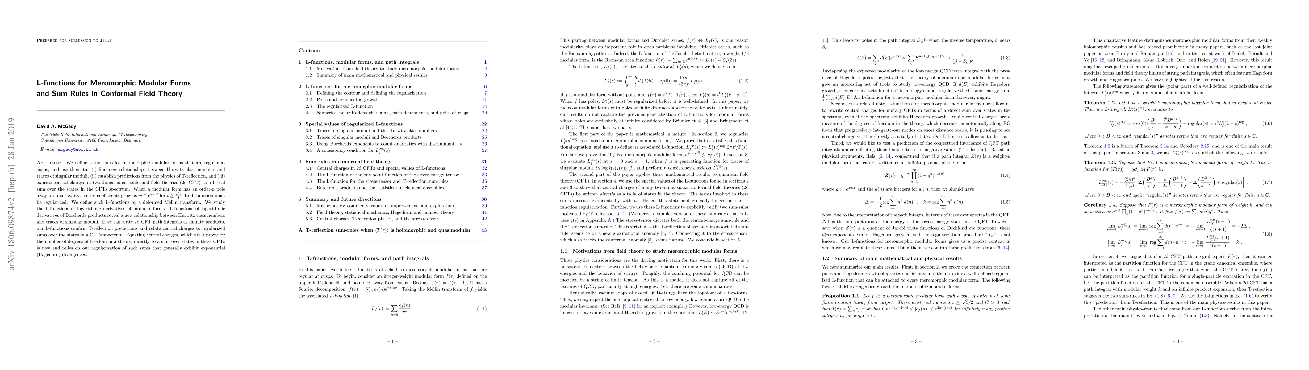 This paper introduces L-functions for meromorphic modular forms, regularizing them via a deformed Mellin transform, and explores their implications in number theory and conformal field theory, including new relationships with Hurwitz class numbers and predictions from T-reflection physics, as well as a novel expression for central charges in 2d CFTs as sums over their state spectra.
