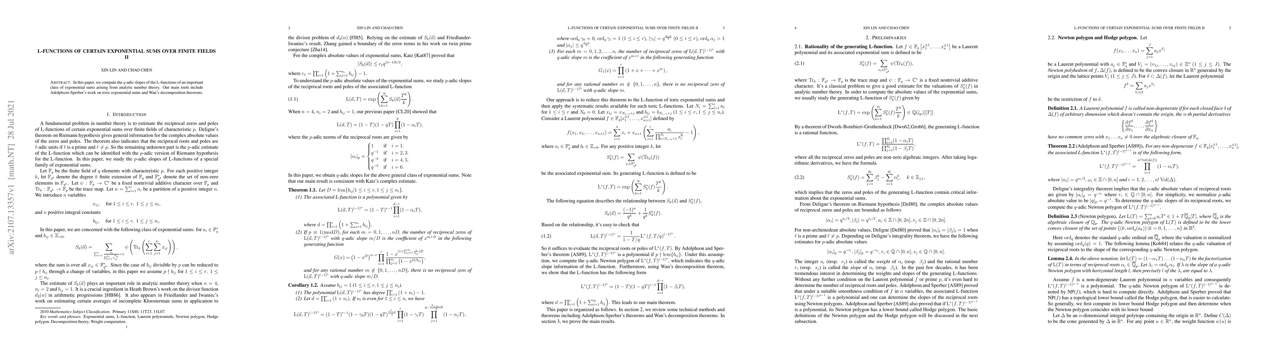 This paper computes the $q$-adic slopes of L-functions for a class of exponential sums in finite fields, utilizing Adolphson-Sperber’s toric sum theory and Wan’s decomposition theorems. The results contribute to analytic number theory.