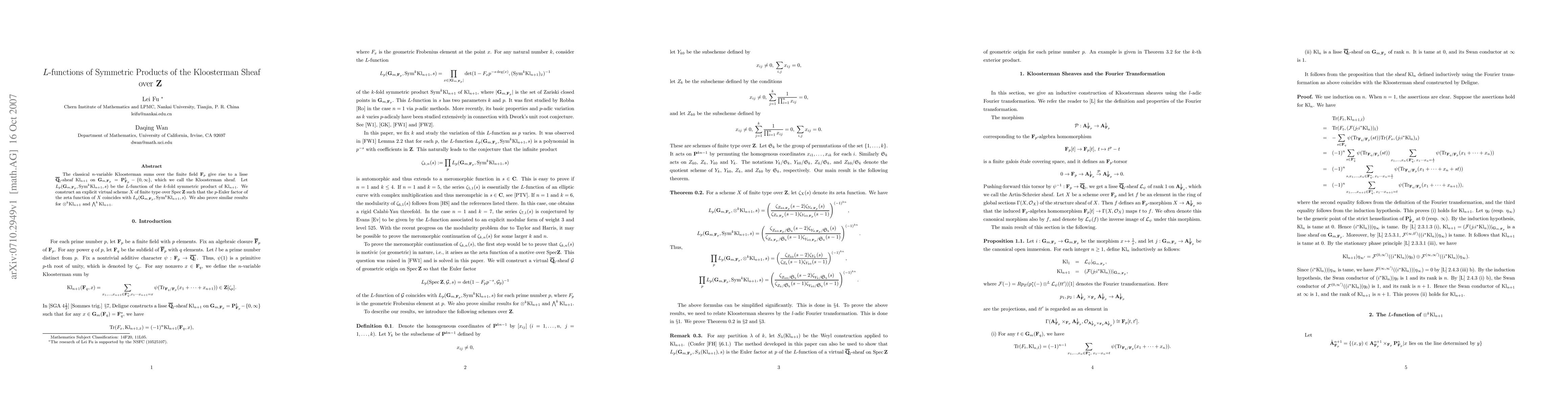 The classical $n$-variable Kloosterman sums over the finite field ${\bf F}_p$ give rise to a lisse $\bar {\bf Q}_l$-sheaf ${\rm Kl}_{n+1}$ on ${\bf G}_{m, {\bf F}_p}={\bf P}^1_{{\bf F}_p}-\{0,\infty\}$, which we call the Kloosterman sheaf. Let $L_p({\bf G}_{m,{\bf F}_p}, {\rm Sym}^k{\rm Kl}_{n+1}, s)$ be the $L$-function of the $k$-fold symmetric product of ${\rm Kl}_{n+1}$. We construct an explicit virtual scheme $X$ of finite type over ${\rm Spec} {\bf Z}$ such that the $p$-Euler factor of the zeta function of $X$ coincides with $L_p({\bf G}_{m,{\bf F}_p}, {\rm Sym}^k{\rm Kl}_{n+1}, s)$. We also prove similar results for $\otimes^k {\rm Kl}_{n+1}$ and $\bigwedge^k {\rm Kl}_{n+1}$.