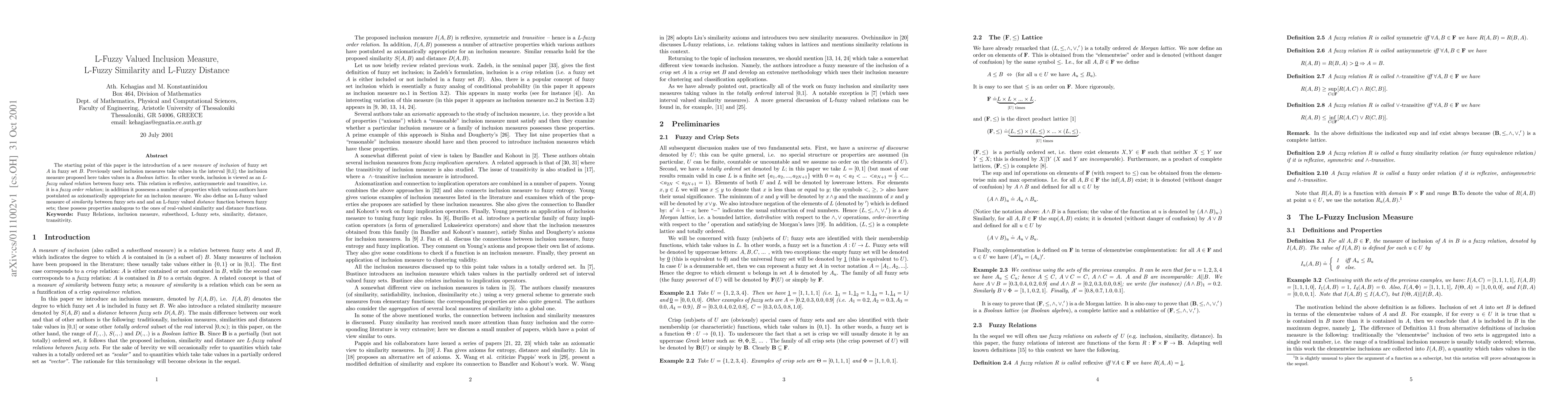 The starting point of this paper is the introduction of a new measure of inclusion of fuzzy set A in fuzzy set B. Previously used inclusion measures take values in the interval [0,1]; the inclusion measure proposed here takes values in a Boolean lattice. In other words, inclusion is viewed as an L-fuzzy valued relation between fuzzy sets. This relation is re exive, antisymmetric and transitive, i.e. it is a fuzzy order relation; in addition it possesess a number of properties which various authors have postulated as axiomatically appropriate for an inclusion measure. We also define an L-fuzzy valued measure of similarity between fuzzy sets and and an L-fuzzy valued distance function between fuzzy sets; these possess properties analogous to the ones of real-valued similarity and distance functions. Keywords: Fuzzy Relations, inclusion measure, subsethood, L-fuzzy sets, similarity, distance, transitivity.