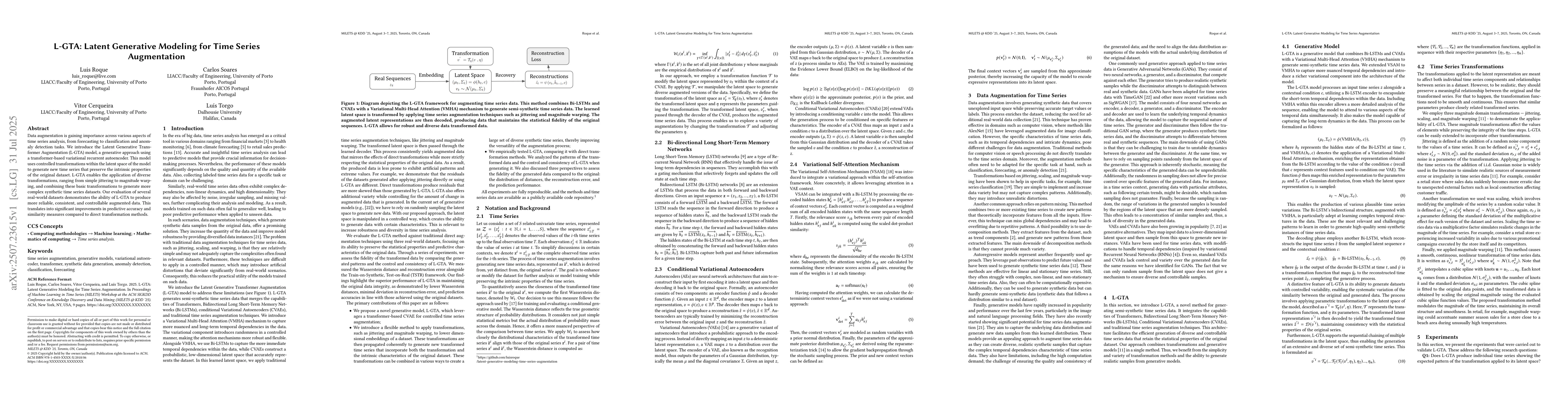 Data augmentation is gaining importance across various aspects of time series analysis, from forecasting to classification and anomaly detection tasks. We introduce the Latent Generative Transformer Augmentation (L-GTA) model, a generative approach using a transformer-based variational recurrent autoencoder. This model uses controlled transformations within the latent space of the model to generate new time series that preserve the intrinsic properties of the original dataset. L-GTA enables the application of diverse transformations, ranging from simple jittering to magnitude warping, and combining these basic transformations to generate more complex synthetic time series datasets. Our evaluation of several real-world datasets demonstrates the ability of L-GTA to produce more reliable, consistent, and controllable augmented data. This translates into significant improvements in predictive accuracy and similarity measures compared to direct transformation methods.