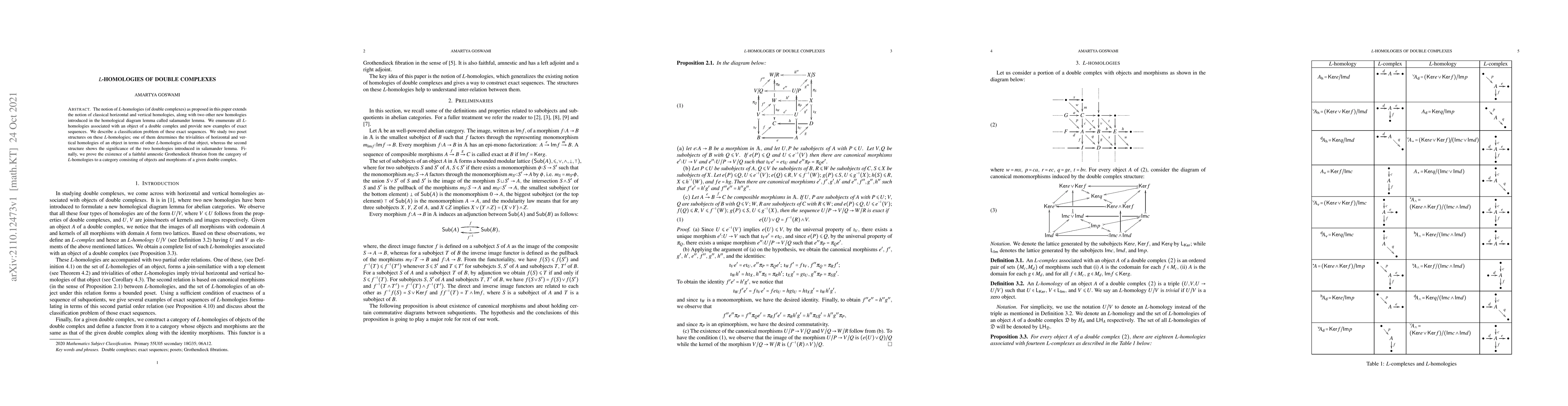 The notion of L-homologies (of double complexes) as proposed in this paper extends the notion of classical horizontal and vertical homologies, along with two other new homologies introduced in the homological diagram lemma called salamander lemma. We enumerate all L-homologies associated with an object of a double complex and provide new examples of exact sequences. We describe a classification problem of these exact sequences. We study two poset structures on these L-homologies; one of them determines the trivialities of horizontal and vertical homologies of an object in terms of other L-homologies of that object, whereas the second structure shows the significance of the two homologies introduced in salamander lemma. Finally, we prove the existence of a faithful amnestic Grothendieck fibration from the category of L-homologies to a category consisting of objects and morphisms of a given double complex.
