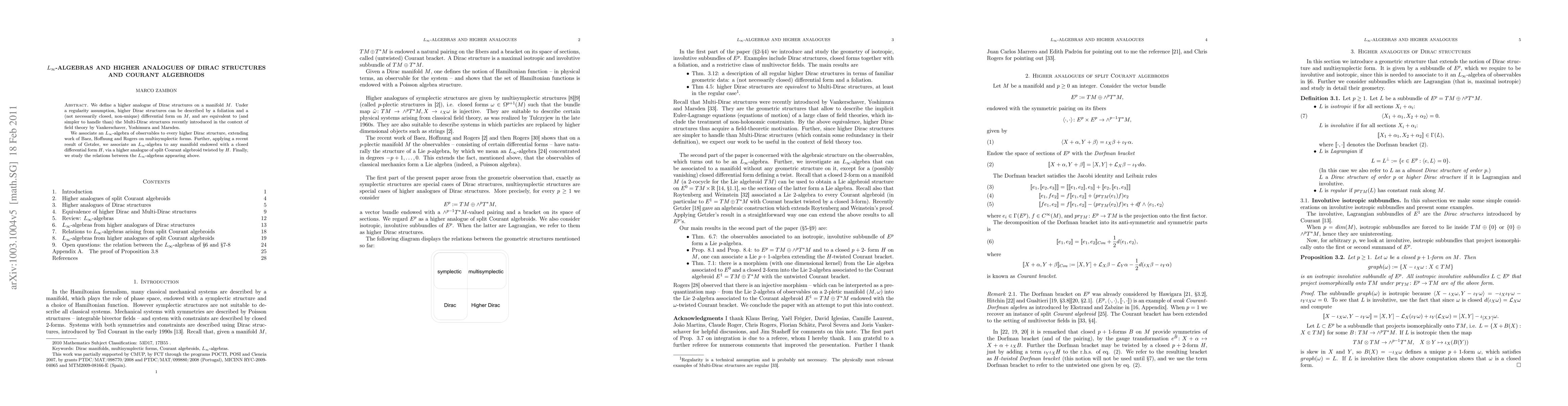 Summary: This paper introduces higher analogues of Dirac structures on manifolds, associated with foliations and differential forms, and links them to L-infinity algebras of observables. It also connects these higher Dirac structures to a "higher analogue of Courant algebroid twisted by H" and studies their interrelations.
