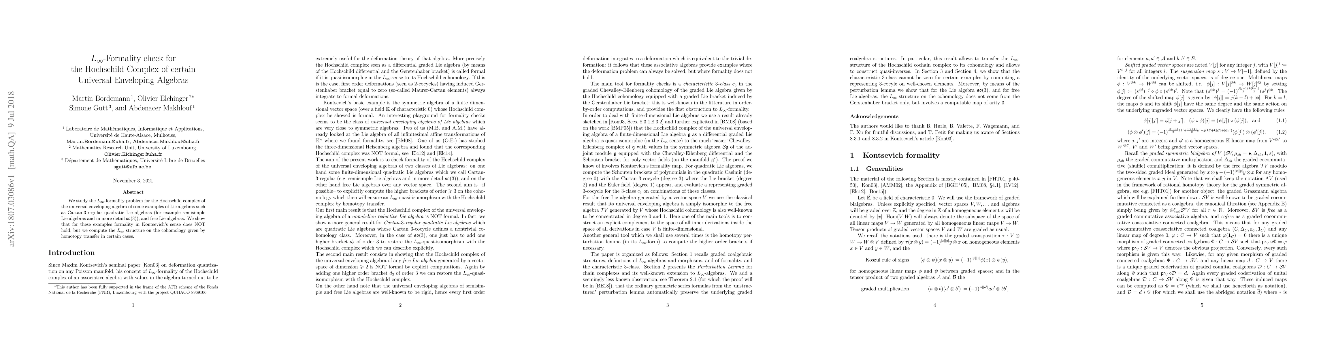 This paper investigates the L-infinity formality of the Hochschild complex for specific universal enveloping algebras, including Cartan-3-regular quadratic Lie algebras and free Lie algebras. The study finds that these examples do not satisfy Kontsevich's formality conjecture, though they exhibit unconditioned deformability, and computes the L-infinity structure on their cohomologies via homotopy transfer.
