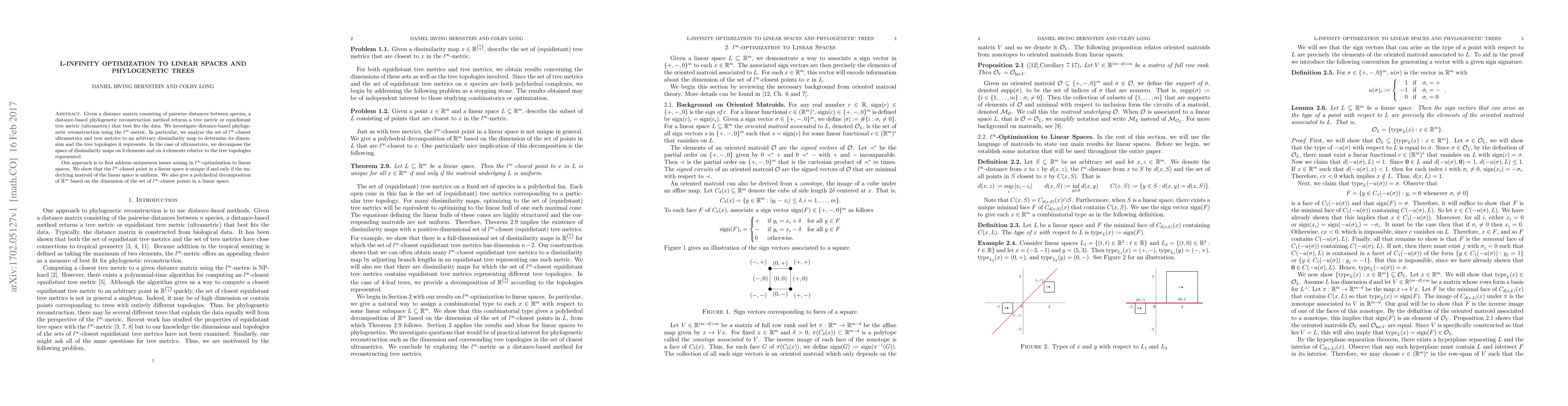 Given a distance matrix consisting of pairwise distances between species, a distance-based phylogenetic reconstruction method returns a tree metric or equidistant tree metric (ultrametric) that best fits the data. We investigate distance-based phylogenetic reconstruction using the $l^\infty$-metric. In particular, we analyze the set of $l^\infty$-closest ultrametrics and tree metrics to an arbitrary dissimilarity map to determine its dimension and the tree topologies it represents. In the case of ultrametrics, we decompose the space of dissimilarity maps on 3 elements and on 4 elements relative to the tree topologies represented. Our approach is to first address uniqueness issues arising in $l^\infty$-optimization to linear spaces. We show that the $l^\infty$-closest point in a linear space is unique if and only if the underlying matroid of the linear space is uniform. We also give a polyhedral decomposition of $\rr^m$ based on the dimension of the set of $l^\infty$-closest points in a linear space.