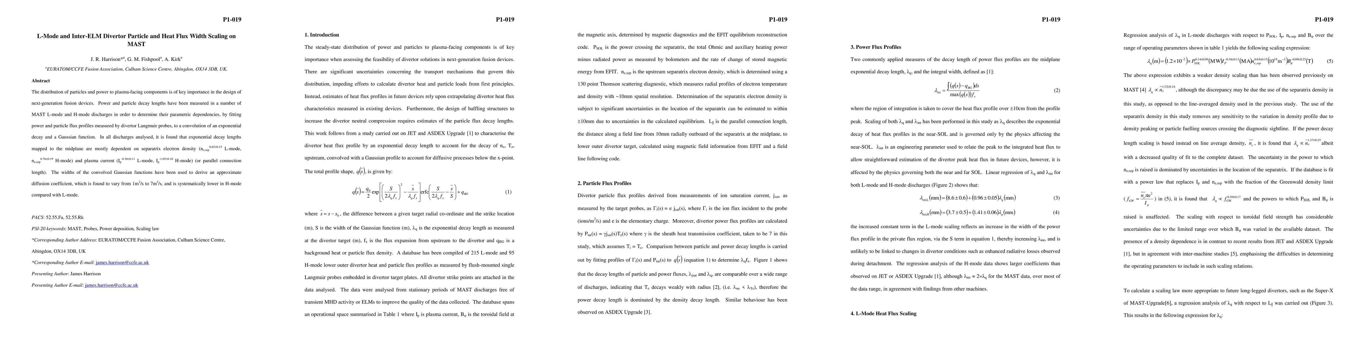 The distribution of particles and power to plasma-facing components is of key importance in the design of next-generation fusion devices. Power and particle decay lengths have been measured in a number of MAST L-mode and H-mode discharges in order to determine their parametric dependencies, by fitting power and particle flux profiles measured by divertor Langmuir probes, to a convolution of an exponential decay and a Gaussian function. In all discharges analysed, it is found that exponential decay lengths mapped to the midplane are mostly dependent on separatrix electron density and plasma current (or parallel connection length). The widths of the convolved Gaussian functions have been used to derive an approximate diffusion coefficient, which is found to vary from 1m2/s to 7m2/s, and is systematically lower in H-mode compared with L-mode.