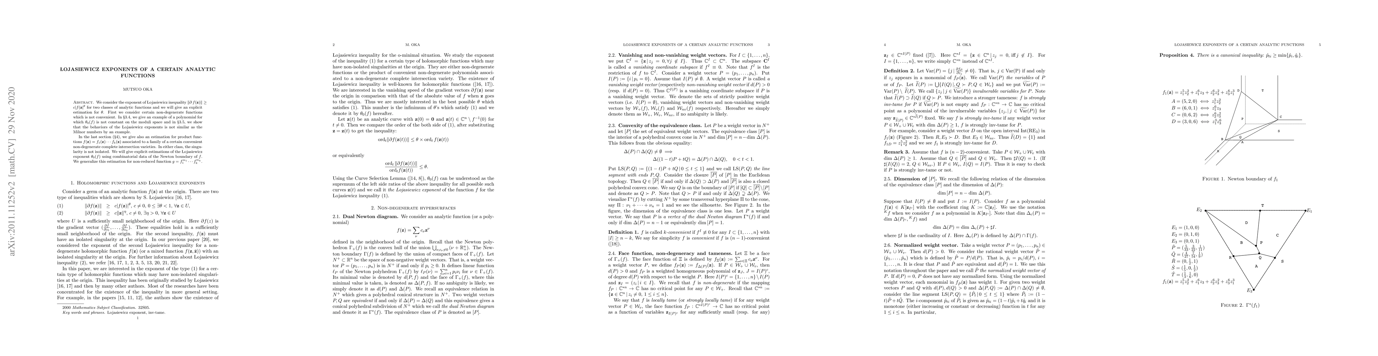 This paper investigates the \L ojasiewicz exponents for specific analytic functions, providing explicit estimations for $\theta$ in both non-degenerate and product function cases. It highlights differences between \L ojasiewicz exponents and Milnor numbers, and uses combinatorial data from the Newton boundary for estimations.