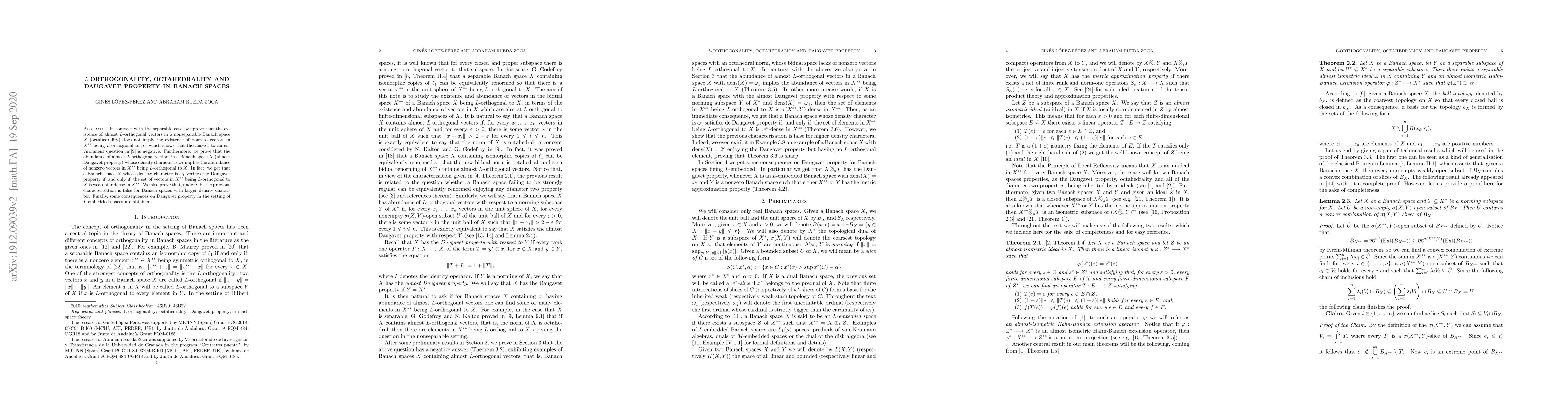 In contrast with the separable case, we prove that the existence of almost $L$-orthogonal vectors in a nonseparable Banach space $X$ (octahedrality) does not imply the existence of nonzero vectors in $X^{**}$ being $L$-orthogonal to $X$, which shows that the answer to an environment question in [9] is negative. Furthermore, we prove that the abundance of almost $L$-orthogonal vectors in a Banach space $X$ (almost Daugavet property) whose density character is $\omega_1$ implies the abundance of nonzero vectors in $X^{**}$ being $L$-orthogonal to $X$. In fact, we get that a Banach space $X$ whose density character is $\omega_1$ verifies the Daugavet property if, and only if, the set of vectors in $X^{**}$ being $L$-orthogonal to $X$ is weak-star dense in $X^{**}$. We also prove that, under CH, the previous characterisation is false for Banach spaces with larger density character. Finally, some consequences on Daugavet property in the setting of $L$-embedded spaces are obtained.