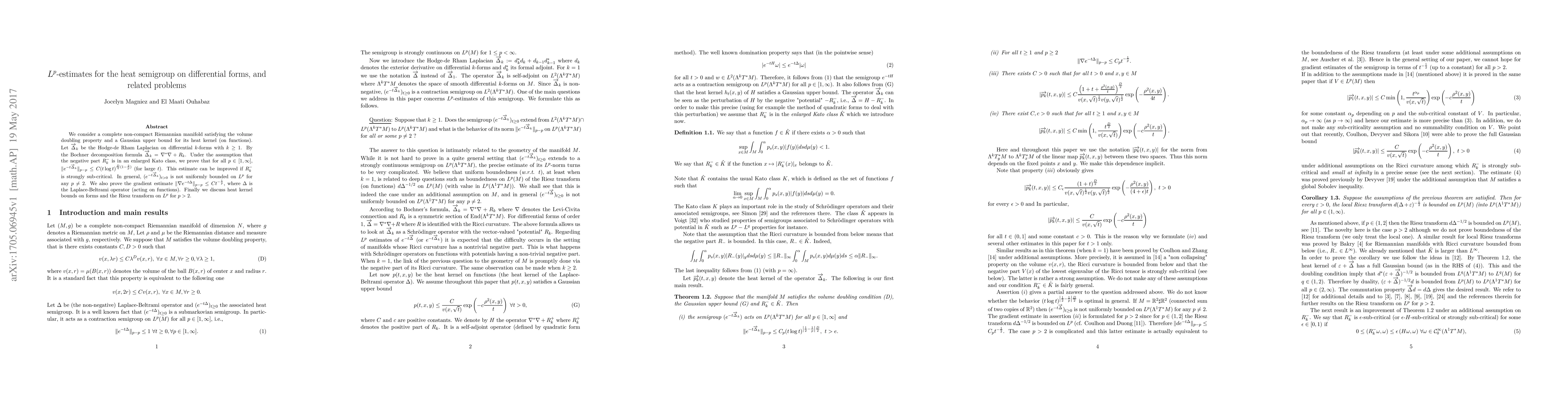 We consider a complete non-compact Riemannian manifold satisfying the volume doubling property and a Gaussian upper bound for its heat kernel (on functions). Let -- $\rightarrow$ $\Delta$ k be the Hodge-de Rham Laplacian on differential k-forms with k $\ge$ 1. By the Bochner decomposition formula -- $\rightarrow$ $\Delta$ k = * + R k. Under the assumption that the negative part R -- k is in an enlarged Kato class, we prove that for all p $\in$ [1, $\infty$], e --t -- $\rightarrow$ $\Delta$ k p--p $\le$ C(t log t) D 4 (1-- 2 p) (for large t). This estimate can be improved if R -- k is strongly sub-critical. In general, (e --t -- $\rightarrow$ $\Delta$ k) t>0 is not uniformly bounded on L p for any p = 2. We also prove the gradient estimate e --t$\Delta$ p--p $\le$ Ct -- 1 p , where $\Delta$ is the Laplace-Beltrami operator (acting on functions). Finally we discuss heat kernel bounds on forms and the Riesz transform on L p for p > 2.