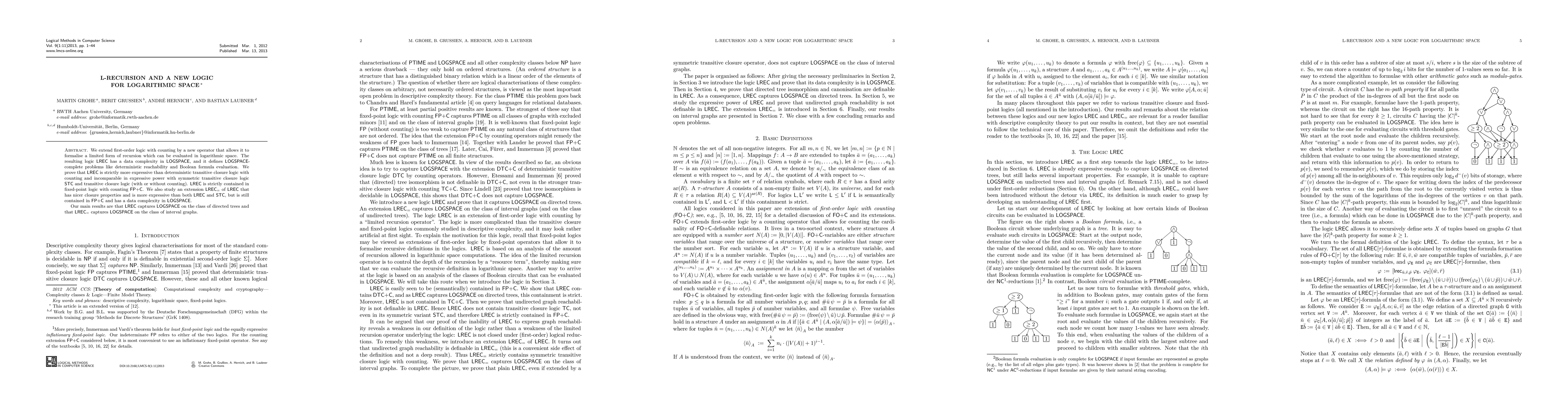 This research introduces LREC, a new logic extending first-order logic with counting, enabling logarithmic space recursion. LREC captures LOGSPACE on directed trees and is more expressive than deterministic transitive closure logic with counting, but less than fixed-point logic with counting. An extension LREC= is also proposed, capturing LOGSPACE on interval graphs with enhanced closure properties.