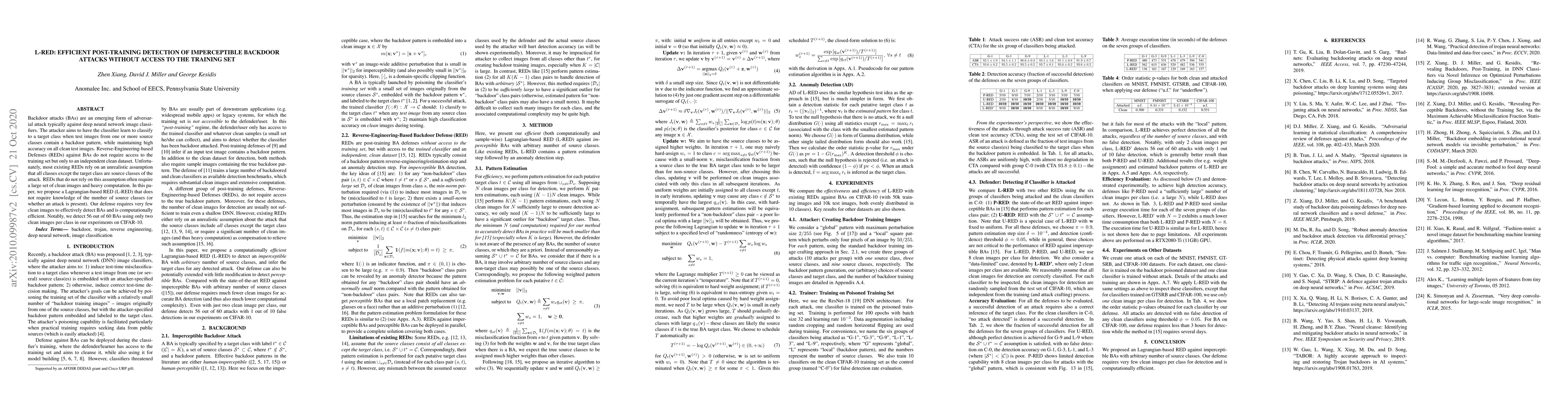 A new defense method, L-RED, detects imperceptible backdoor attacks on image classifiers without access to the training set, using only a few clean images and requiring minimal computation.