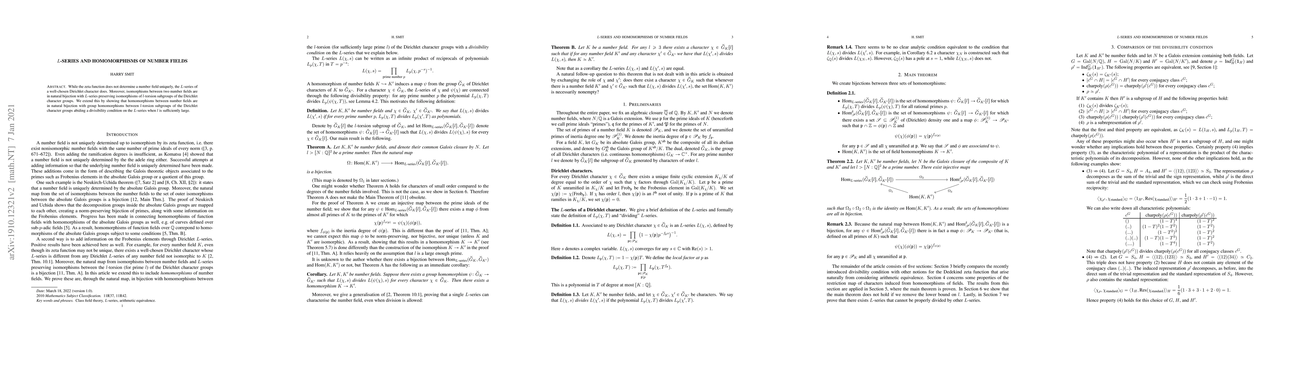 While the zeta function does not determine a number field uniquely, the $L$-series of a well-chosen Dirichlet character does. Moreover, isomorphisms between two number fields are in natural bijection with $L$-series preserving isomorphisms of $l$-torsion subgroups of the Dirichlet character groups. We extend this by showing that homomorphisms between number fields are in natural bijection with group homomorphisms between $l$-torsion subgroups of the Dirichlet character groups abiding a divisibility condition on the $L$-series when $l$ is sufficiently large.