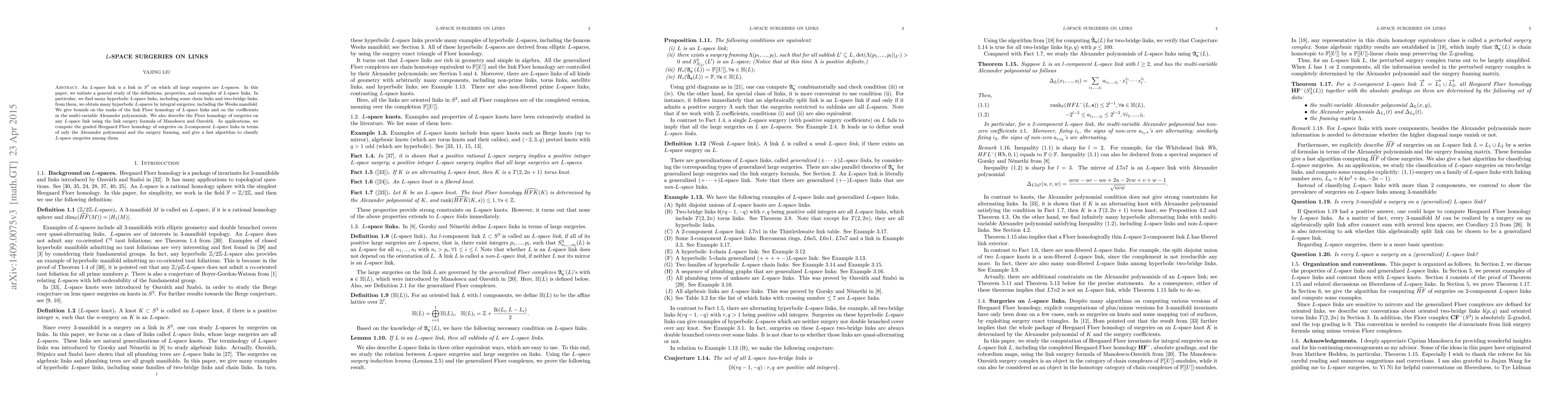 An $L$-space link is a link in $S^3$ on which all large surgeries are $L$-spaces. In this paper, we initiate a general study of the definitions, properties, and examples of $L$-space links. In particular, we find many hyperbolic $L$-space links, including some chain links and two-bridge links; from them, we obtain many hyperbolic $L$-spaces by integral surgeries, including the Weeks manifold. We give bounds on the ranks of the link Floer homology of $L$-space links and on the coefficients in the multi-variable Alexander polynomials. We also describe the Floer homology of surgeries on any $L$-space link using the link surgery formula of Ozsv\'{a}th and Manolescu. As applications, we compute the graded Heegaard Floer homology of surgeries on 2-component $L$-space links in terms of only the Alexander polynomial and the surgery framing, and give a fast algorithm to classify $L$-space surgeries among them.