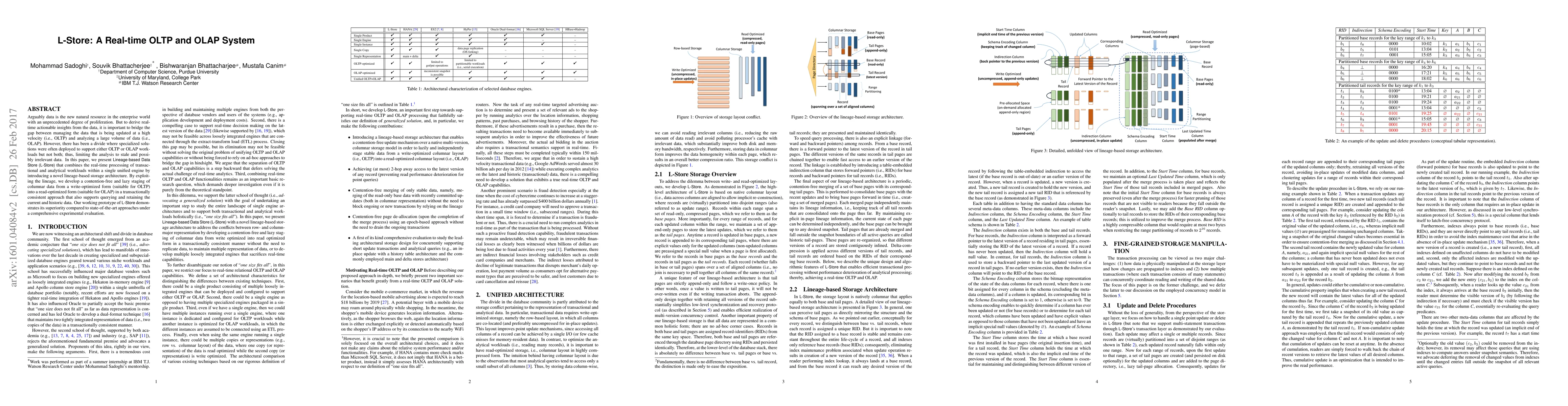 L-Store is a unified real-time OLTP and OLAP system that bridges the gap between high-velocity transactional data processing and large-volume analytical workloads using a novel lineage-based storage architecture, demonstrating superior performance in experimental evaluations.