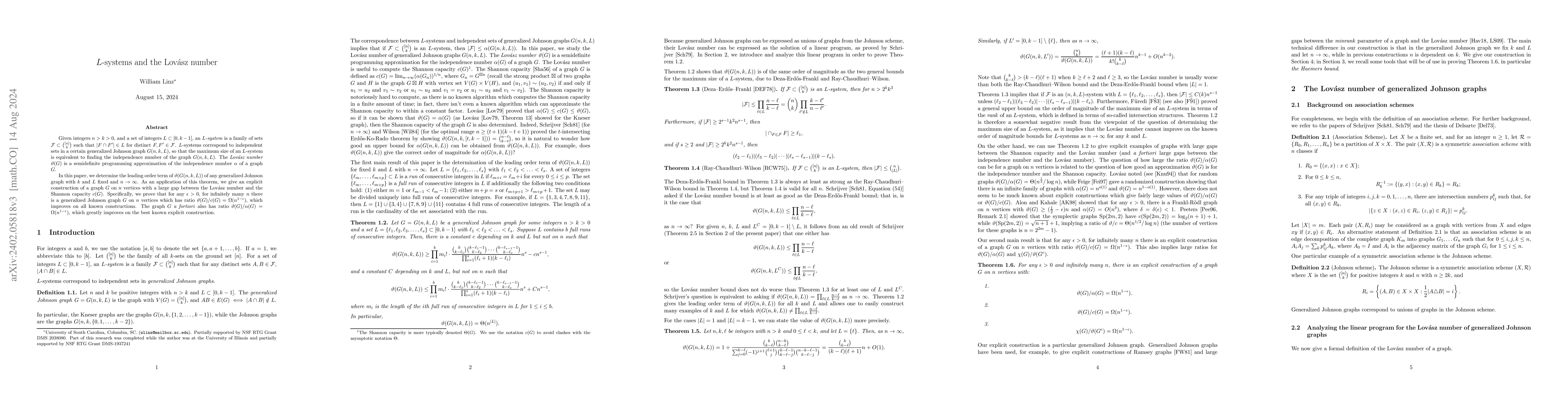 Given integers $n > k > 0$, and a set of integers $L \subset [0, k-1]$, an \emph{$L$-system} is a family of sets $\mathcal{F} \subset \binom{[n]}{k}$ such that $|F \cap F'| \in L$ for distinct $F, F'\in \mathcal{F}$. $L$-systems correspond to independent sets in a certain generalized Johnson graph $G(n, k, L)$, so that the maximum size of an $L$-system is equivalent to finding the independence number of the graph $G(n, k, L)$. The \emph{Lov\'asz number} $\vartheta(G)$ is a semidefinite programming approximation of the independence number $\alpha$ of a graph $G$. In this paper, we determine the leading order term of $\vartheta(G(n, k, L))$ of any generalized Johnson graph with $k$ and $L$ fixed and $n\rightarrow \infty$. As an application of this theorem, we give an explicit construction of a graph $G$ on $n$ vertices with a large gap between the Lov\'asz number and the Shannon capacity $c(G)$. Specifically, we prove that for any $\epsilon > 0$, for sufficiently large $n$ there is a generalized Johnson graph $G$ on $n$ vertices which has ratio $\vartheta(G)/c(G) = \Omega(n^{1-\epsilon})$, which improves on all known constructions. The graph $G$ \textit{a fortiori} also has ratio $\vartheta(G)/\alpha(G) = \Omega(n^{1-\epsilon})$, which greatly improves on the best known explicit construction.