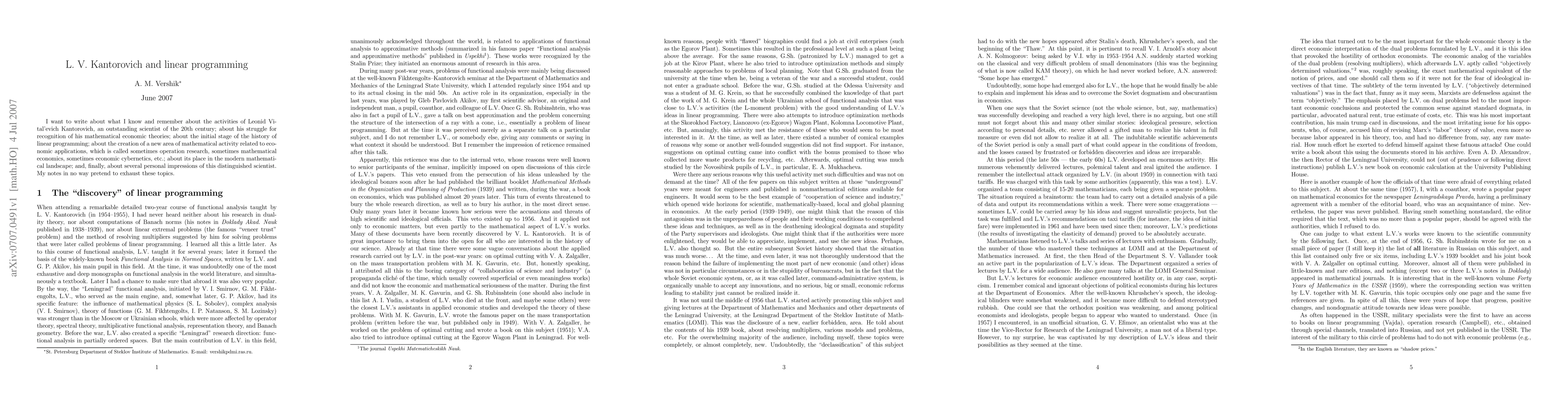 I want to write about what I know and remember about the activities of Leonid Vital'evich Kantorovich, an outstanding scientist of the 20th century; about his dramatic struggle for recognition of his mathematical economic theories; about the initial stage of the history of linear programming; about beautuful Kantorovich metric, about the creation of a new area of mathematical activity related to economic applications, which is called sometimes operation research, sometimes mathematical economics, sometimes linear and convex programming, or economic cybernetics, etc.; about its place in the modern mathematical landscape; and, finally, about several personal impressions of this distinguished scientist. The notes in no way pretend to exhaust these topics.