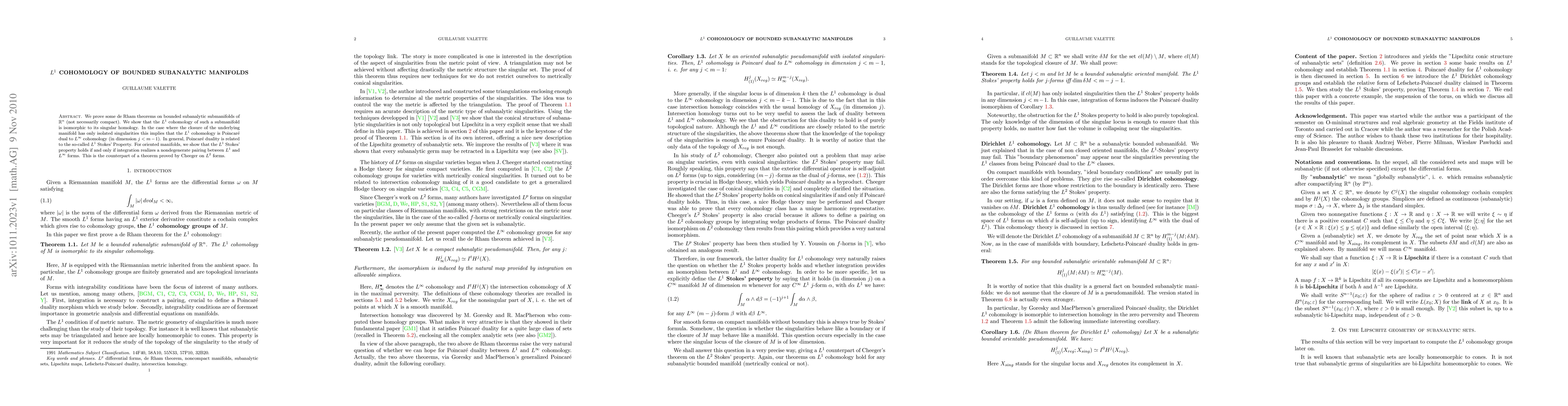 Researchers prove a connection between $L^1$ cohomology and singular homology of bounded subanalytic manifolds, with implications for Poincar\e duality and the $L^1$ Stokes' Property.
