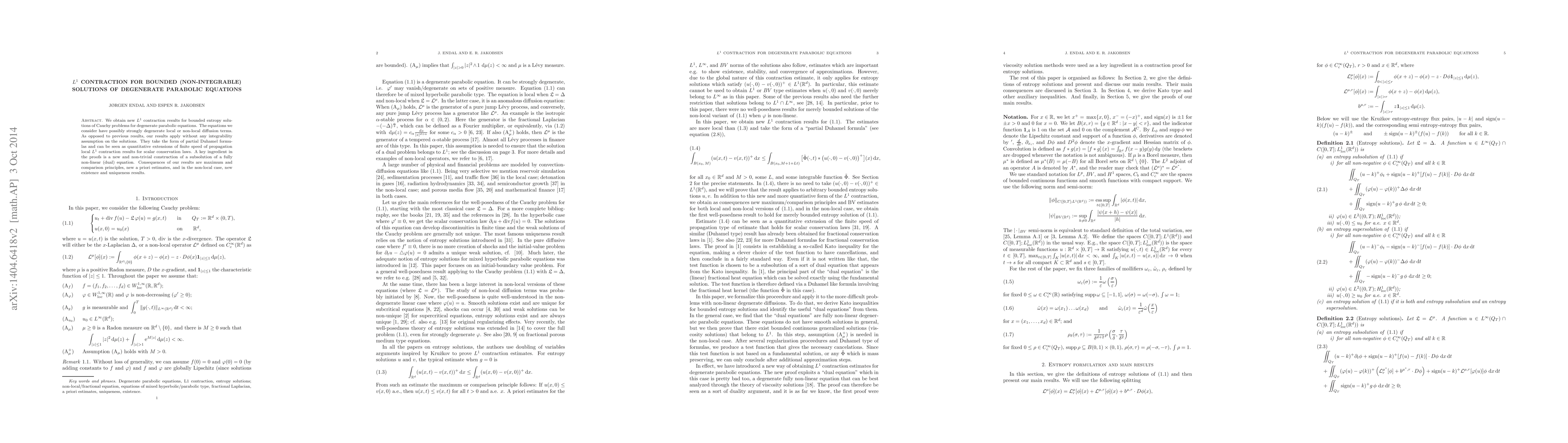 We obtain new $L^1$ contraction results for bounded entropy solutions of Cauchy problems for degenerate parabolic equations. The equations we consider have possibly strongly degenerate local or non-local diffusion terms. As opposed to previous results, our results apply without any integrability assumption on the %(the positive part of the difference of) solutions. They take the form of partial Duhamel formulas and can be seen as quantitative extensions of finite speed of propagation local $L^1$ contraction results for scalar conservation laws. A key ingredient in the proofs is a new and non-trivial construction of a subsolution of a fully non-linear (dual) equation. Consequences of our results are maximum and comparison principles, new a priori estimates, and in the non-local case, new existence and uniqueness results.