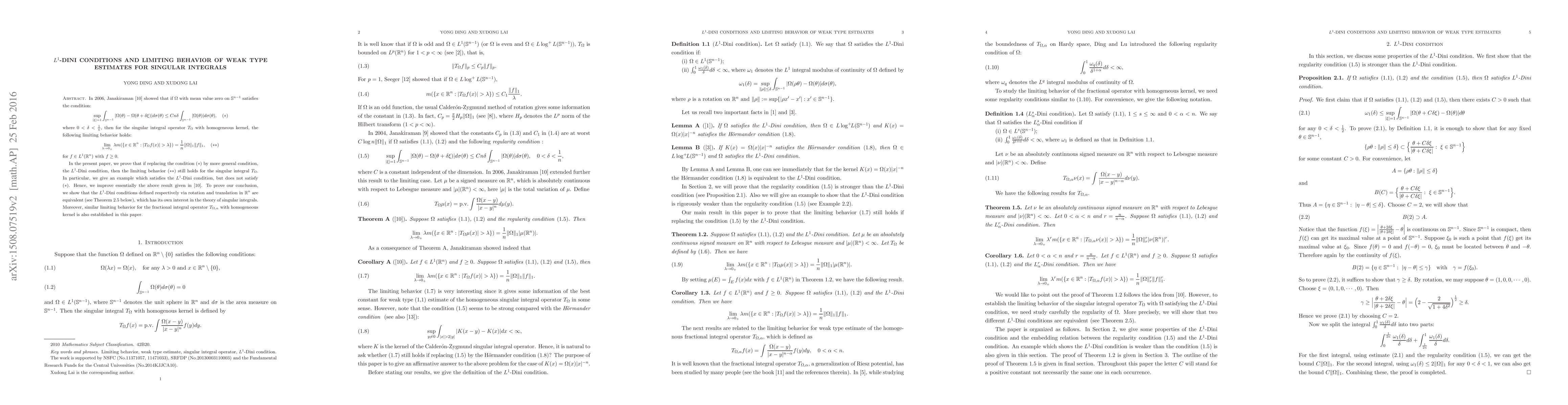 In 2006, Janakiraman [10] showed that if $\Omega$ with mean value zero on $S^{n-1}$ satisfies the condition \[ \sup_{|\xi|=1}\int_{S^{n-1}}|\Omega(\theta)-\Omega(\theta+\delta\xi)|d\sigma(\theta)\leq Cn\delta\int_{S^{n-1}}|\Omega(\theta)|d\sigma(\theta),\quad 0<\delta<\frac{1}{n},\ (\ast) \] then for the singular integral operator $T_\Omega$ with homogeneous kernel, the following limiting behavior holds: \[\lim\limits_{\lambda\rightarrow 0}\lambda m(\{x\in\mathbb{R}^n:|T_\Omega f(x)|>\lambda\})= \frac{1}{n}\|\Omega\|_{1}\|f\|_{1},\quad \text{for}\ f\in L^1(\mathbb{R}^n)\ \text{with}\ f\geq 0.\ (\ast\ast)\] In the present paper, we prove that if replacing the condition $(\ast)$ by more general condition, the $L^1$-Dini condition, then the limiting behavior $(\ast\ast)$ still holds for the singular integral $T_\Omega$. In particular, we give an example which satisfies the $L^1$-Dini condition, but does not satisfy $(\ast)$. Hence, we improve essentially the above result given in [10]. To prove our conclusion, we show that the $L^1$-Dini conditions defined respectively via the rotation and translation on $\mathbb{R}^n$ are equivalent (see Theorem 2.5 below), which has its own interest in the theory of singular integrals. Moreover, similar limiting behavior for the fractional integral operator $T_{\Omega,\alpha}$ with homogeneous kernel is also established in this paper.