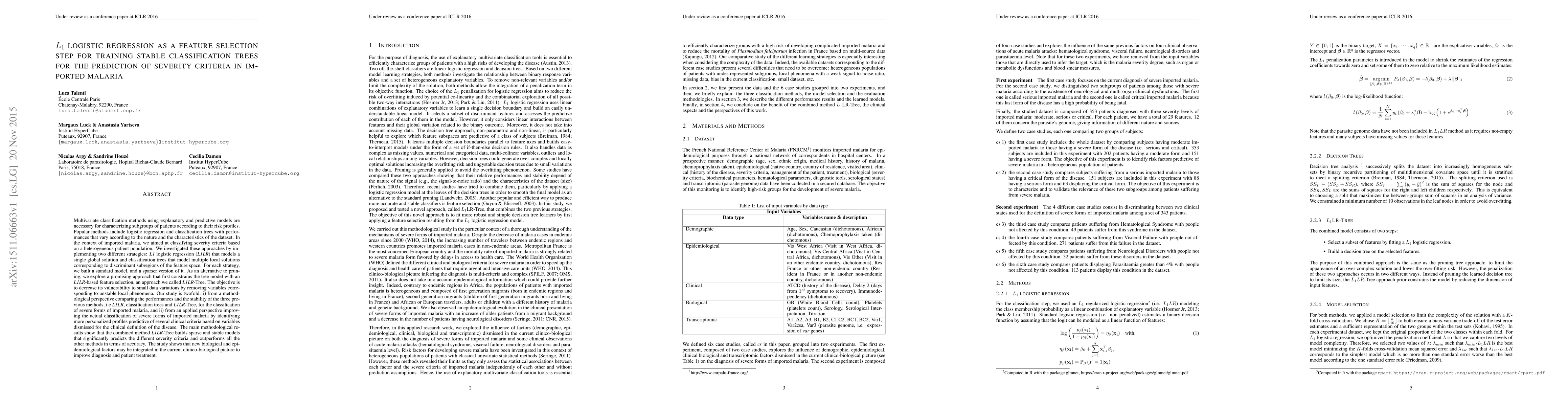 A study compares two methods for training stable classification trees to predict malaria severity: L1 logistic regression as a feature selection step and a new approach called L1LR-Tree, which combines the two with significant accuracy gains.