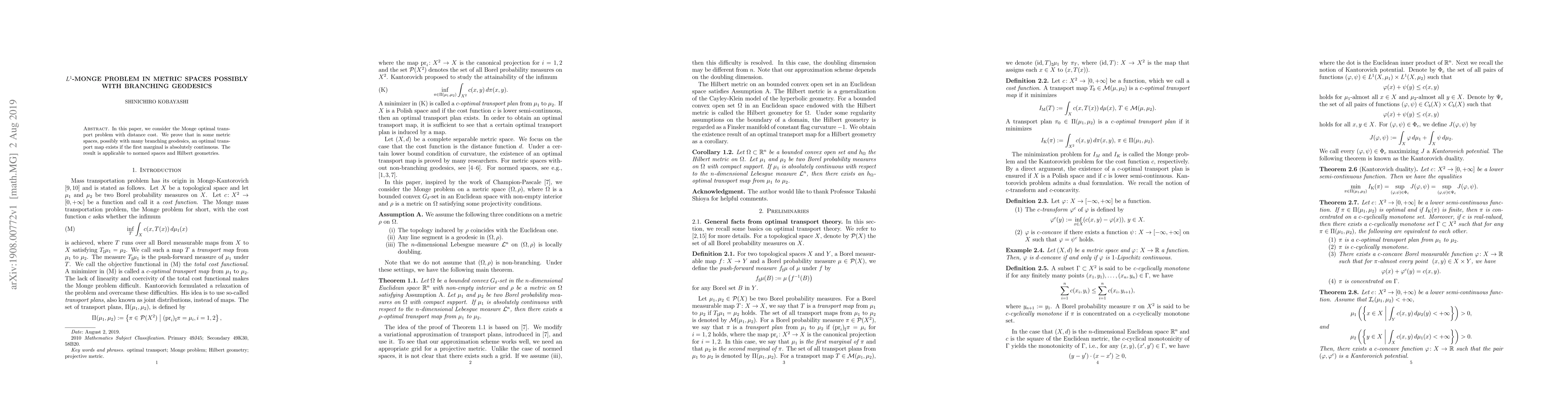 In this paper, we consider the Monge optimal transport problem with distance cost. We prove that in some metric spaces, possibly with many branching geodesics, an optimal transport map exists if the first marginal is absolutely continuous. The result is applicable to normed spaces and Hilbert geometries.