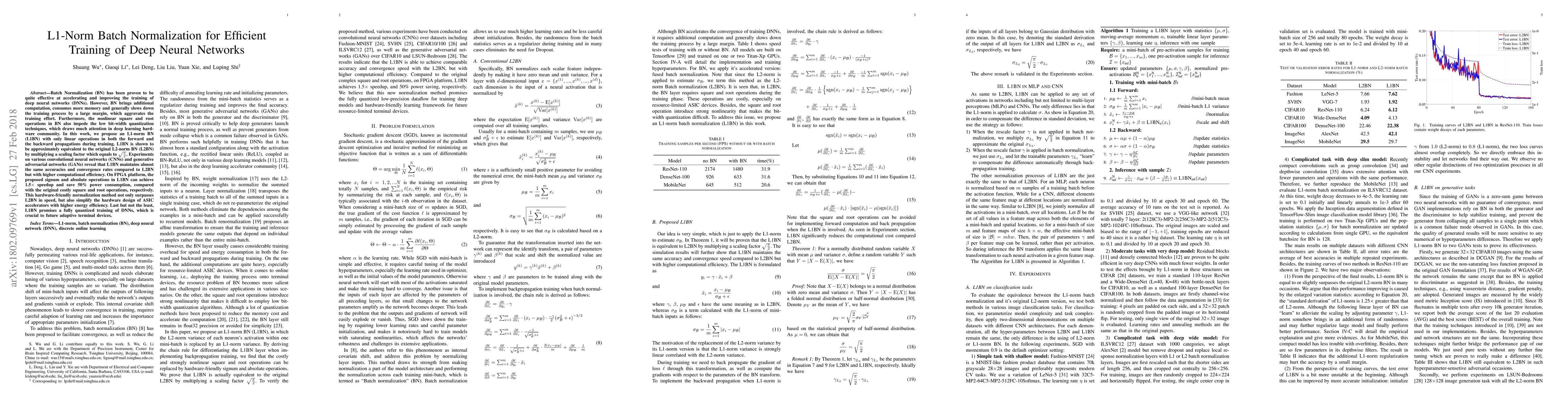 This paper proposes L1-norm Batch Normalization (L1BN) to improve the efficiency of training deep neural networks. Unlike traditional L2-norm Batch Normalization, L1BN uses only linear operations, achieving similar accuracy and convergence rates while significantly reducing computational cost and power consumption, especially beneficial for hardware implementations.