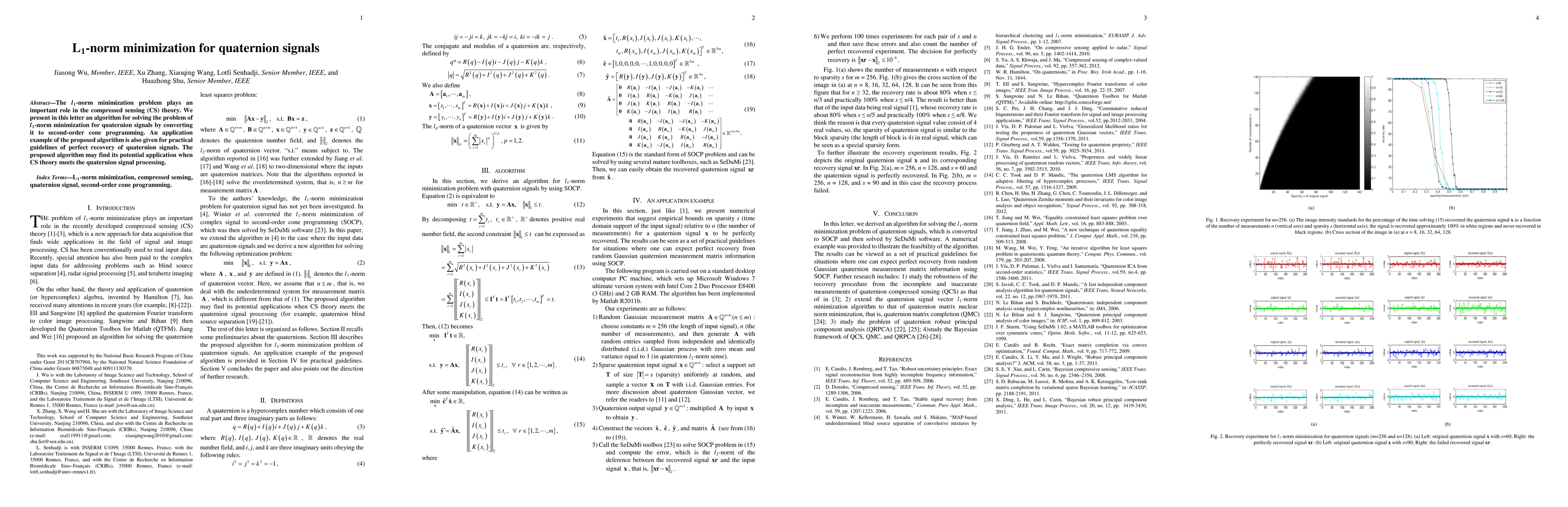 This paper proposes an algorithm for solving the l1-norm minimization problem for quaternion signals by converting it to second-order cone programming, demonstrating its potential application in compressed sensing for quaternion signal processing. An example application is provided to illustrate the practical recovery of quaternion signals.