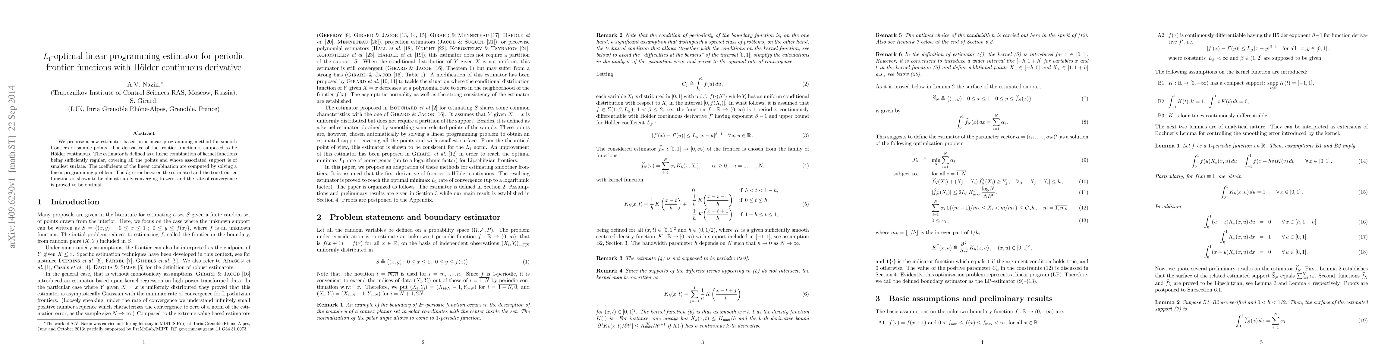 We propose a new estimator based on a linear programming method for smooth frontiers of sample points. The derivative of the frontier function is supposed to be Holder continuous.The estimator is defined as a linear combination of kernel functions being sufficiently regular, covering all the points and whose associated support is of smallest surface. The coefficients of the linear combination are computed by solving a linear programming problem. The L1- error between the estimated and the true frontier functionsis shown to be almost surely converging to zero, and the rate of convergence is proved to be optimal.