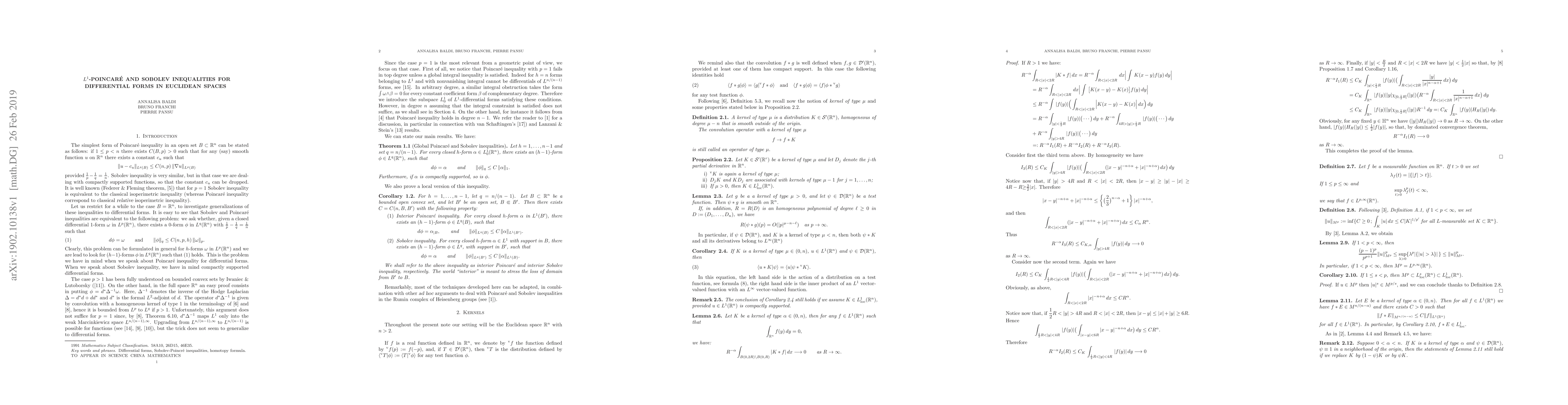 Summary: This paper establishes $L^1$-Poincaré and Sobolev inequalities for differential forms in Euclidean spaces, utilizing Bourgain-Brezis inequalities instead of singular integral estimates for $L^p$, $p>1$.