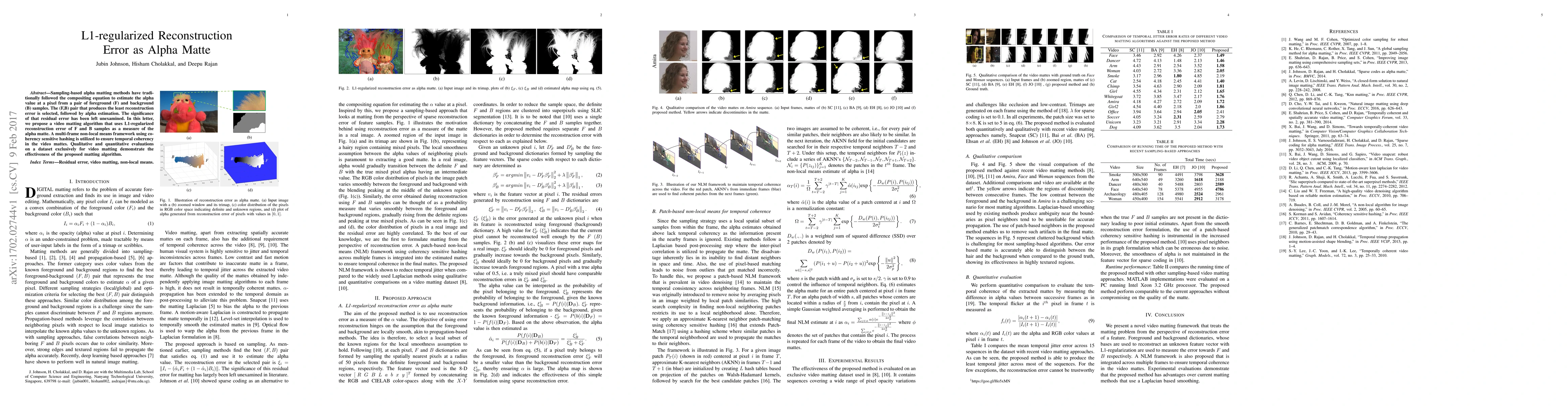 A new video matting algorithm uses L1-regularized reconstruction error to estimate alpha matte values, achieving better results in qualitative and quantitative evaluations on a dedicated dataset.