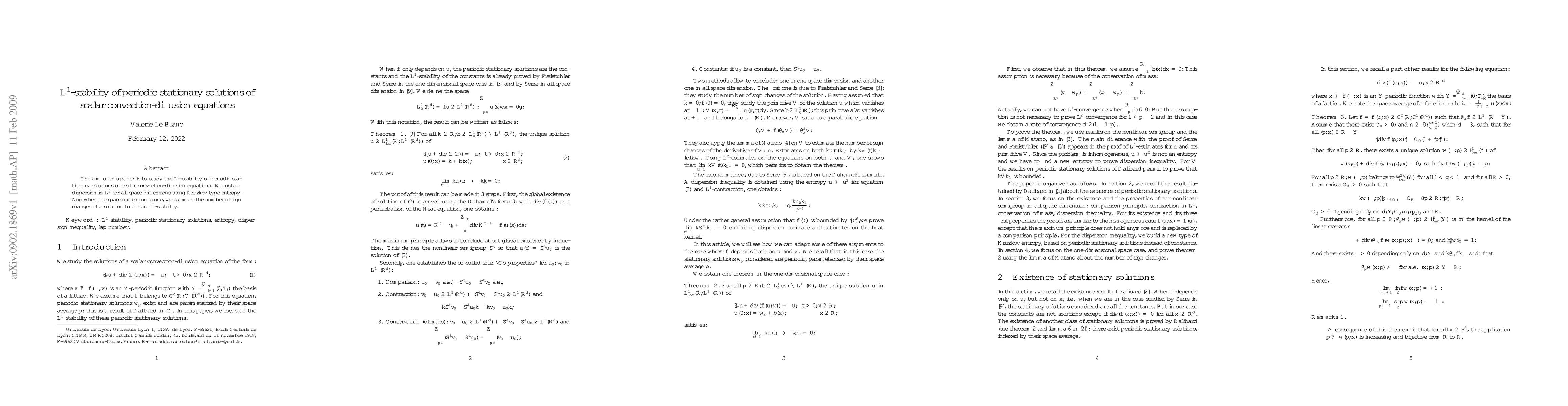 The aim of this paper is to study the $L^1$-stability of periodic stationary solutions of scalar convection-diffusion equations. We obtain dispersion in $L^2$ for all space dimensions using Kru\v{z}kov type entropy. And when the space dimension is one, we estimate the number of sign changes of a solution to obtain $L^1$-stability.