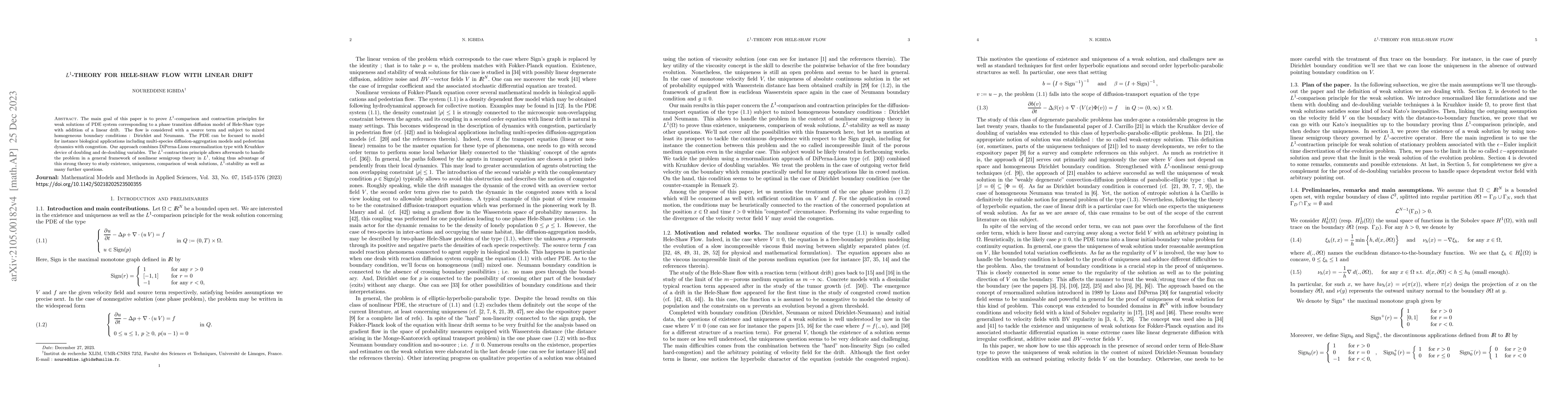 The main goal of this paper is to prove $L^1$-comparison and contraction principles for weak solutions (in the sense of distributions) of Hele-Shaw flow with a linear Drift. The flow is considered with a general reaction term including the Lipschitz continuous case, and subject to mixed homogeneous boundary conditions : Dirichlet and Neumann. Our approach combines DiPerna-Lions renormalization type with Kruzhkov device of doubling and de-doubling variables. The $L^1$-contraction principle allows afterwards to handle the problem in a general framework of nonlinear semigroup theory in $L^1,$ taking thus advantage of this strong theory to study existence, uniqueness, comparison of weak solutions, $L^1$-stability as well as many further questions.