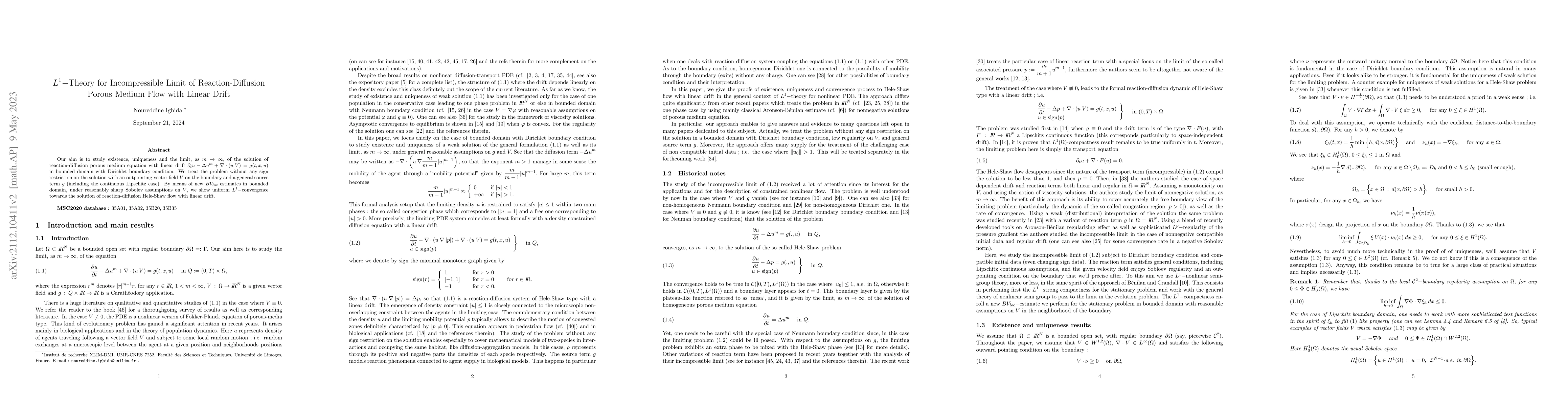 This paper investigates the $L^1$-convergence of solutions to the reaction-diffusion porous medium equation with linear drift as the exponent $m$ approaches infinity, demonstrating convergence to the Hele-Shaw flow solution using new $BV_{loc}$ estimates. The study focuses on bounded domains with Dirichlet boundary conditions and compatible initial data.