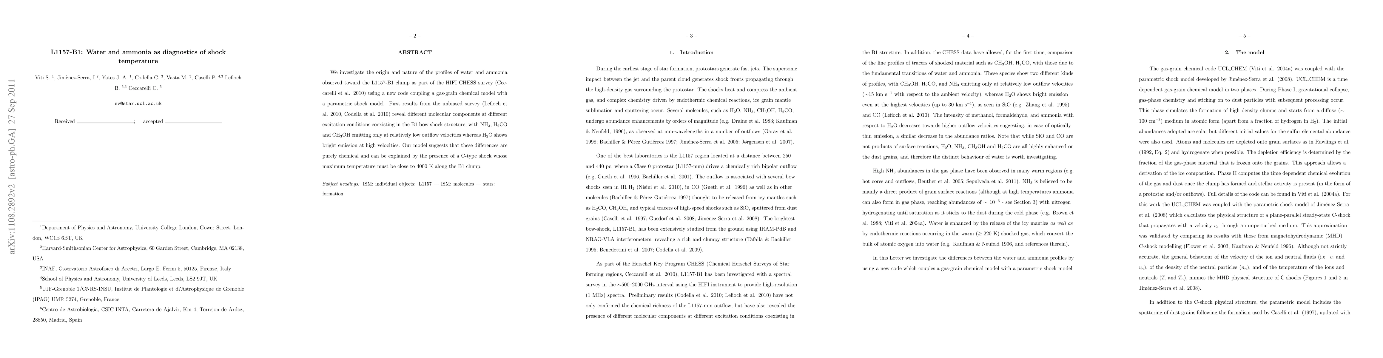 We investigate the origin and nature of the profiles of water and ammonia observ ed toward the L1157-B1 clump as part of the HIFI CHESS survey (Ceccarelli et al. 2010) using a new code coupling a gas-grain chemical model with a parametric shock model. Fir st results from the unbiased survey (Lefloch et al. 2010, Codella et al. 2010) reveal different molecular components at different excitation conditions coexisting in the B1 bow shock structure, with NH$_3$, H$_2$CO and CH$_3$OH emitting only at relatively low outflow velocities whereas H$_2$O shows bright emission at high velocities. Our model suggests that these differences are purely chemical and can be explained by the presence of a C-type shock whose maximum temperature must be close to 4000 K along the B1 clump.