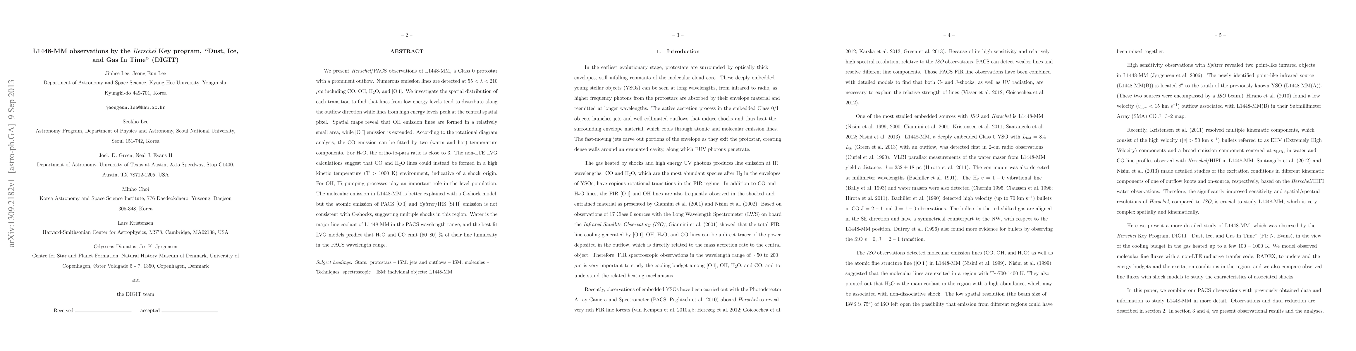 The Herschel/PACS observations of L1448-MM, a Class 0 protostar, reveal distinct spatial distributions for various molecular emission lines. Low-energy transitions align with the outflow, while high-energy ones peak at the core. CO and H2O lines suggest warm and hot components, indicating shock-excitation, with water as the primary coolant. Non-LTE LVG calculations and C-shock models support this, though atomic emissions like [O I] and [Si II] suggest multiple shock events in the region.