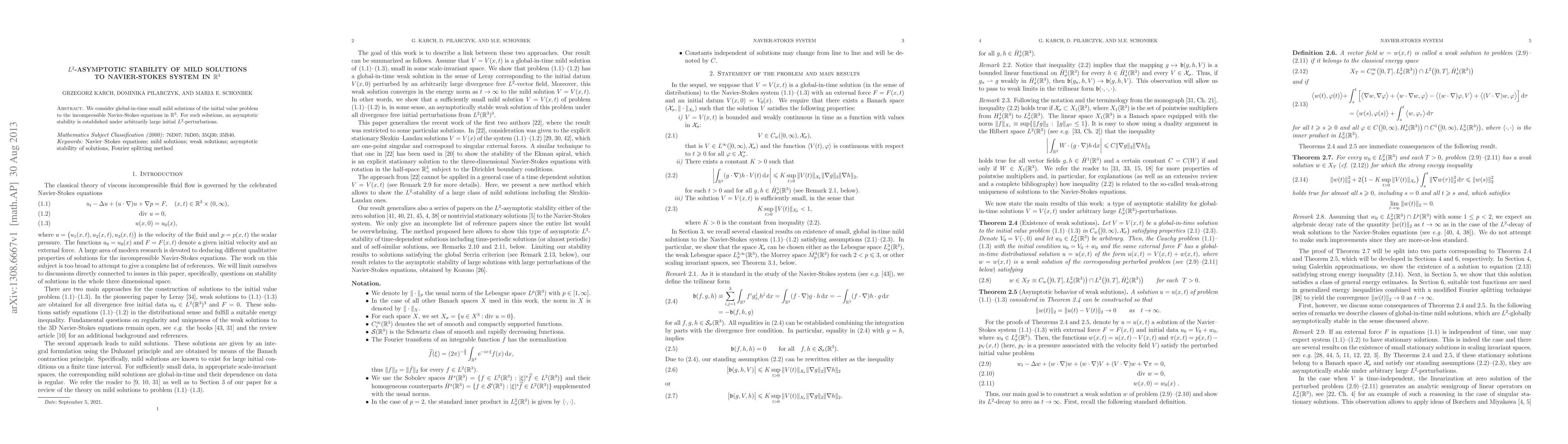 Summary: This paper investigates global-in-time small mild solutions of the incompressible Navier-Stokes equations in $R^3$ and proves $L^2$-asymptotic stability for these solutions under significant initial $L^2$-perturbations.