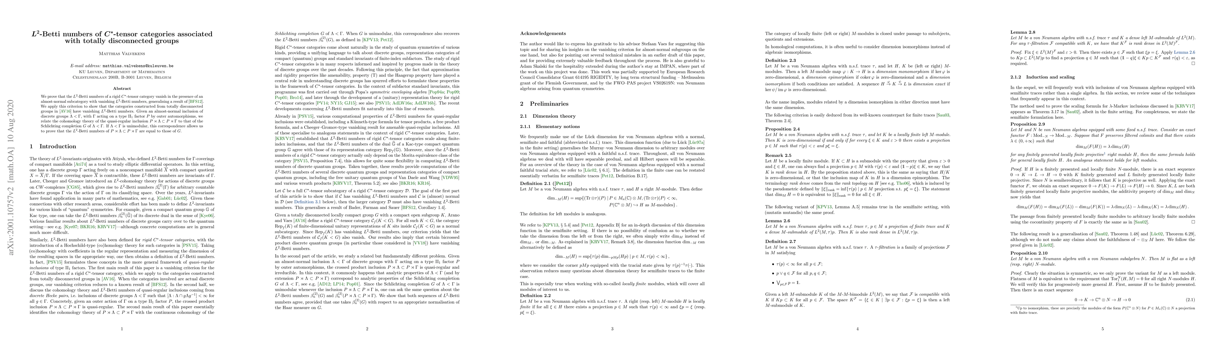 This paper proves that $L^2$-Betti numbers of rigid $C^*$-tensor categories vanish when they contain an almost-normal subcategory with vanishing $L^2$-Betti numbers, applying this to categories from totally disconnected groups. It also relates the $L^2$-Betti numbers of group actions on type $\mathrm{II}_1$ factors to those of their Schlichting completions.