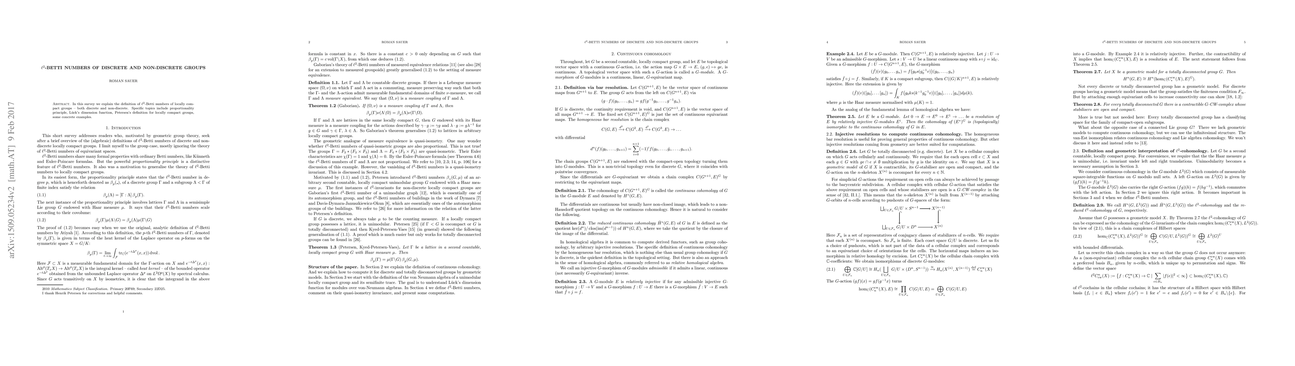 This paper surveys the definition and properties of l2-Betti numbers for both discrete and non-discrete locally compact groups, including the proportionality principle, dimension function, and Petersen's definition, with examples provided.