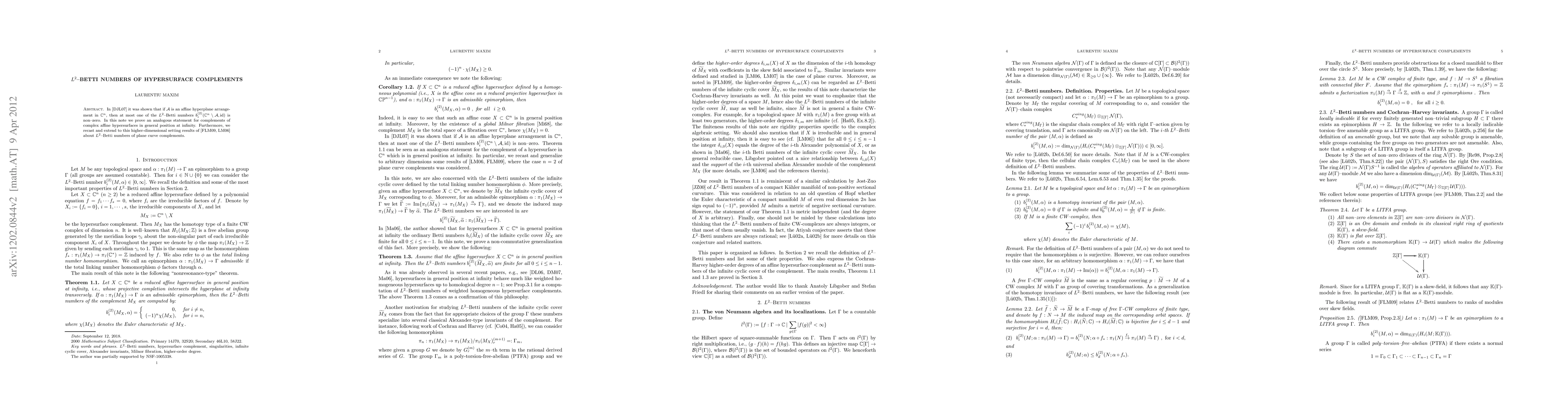 This paper proves that the complements of complex affine hypersurfaces in general position have at most one non-zero $L^2$-Betti number, extending prior results for affine hyperplane arrangements and complements of plane curves.