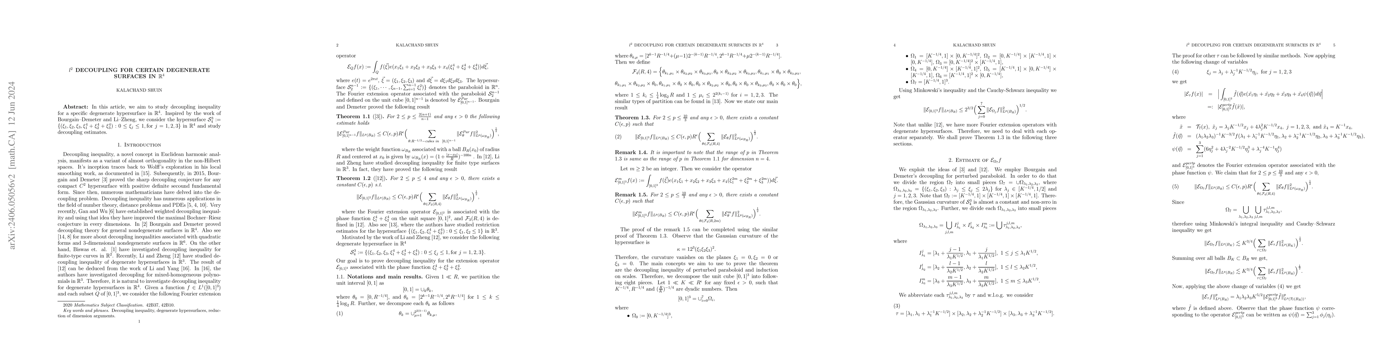 This paper investigates the decoupling inequality for the degenerate hypersurface $\mathcal{S}^3_{4}$ in $\mathbb{R}^4$, inspired by previous work in harmonic analysis. The authors aim to establish decoupling estimates for this specific geometric object.