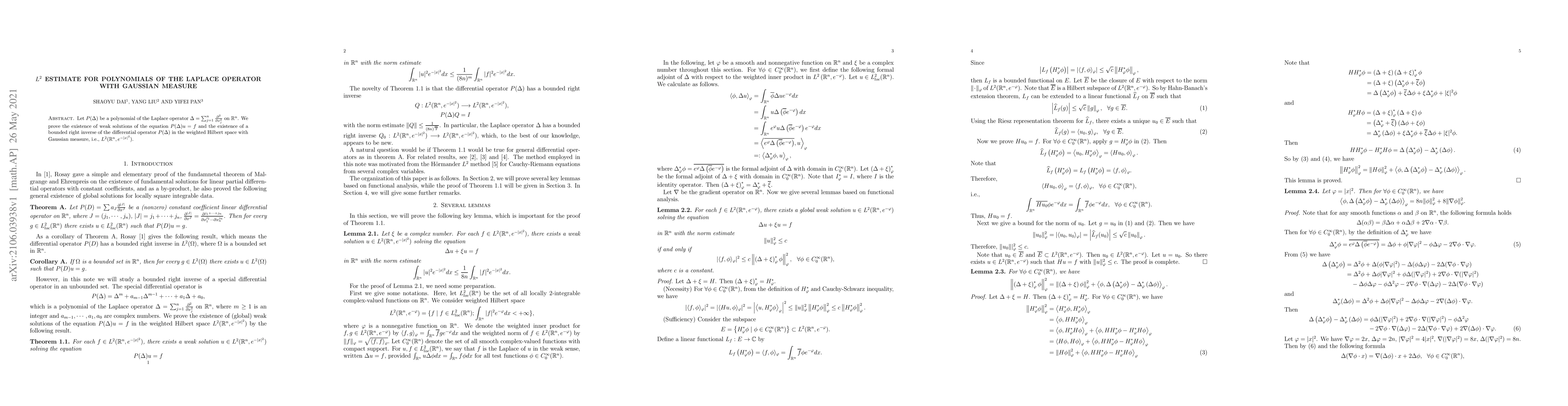 Let $P(\Delta)$ be a polynomial of the Laplace operator $\Delta=\sum_{j=1}^n\frac{\partial^2}{\partial x^2_j}$ on $\mathbb{R}^n$. We prove the existence of weak solutions of the equation $P(\Delta)u=f$ and the existence of a bounded right inverse of the differential operator $P(\Delta)$ in the weighted Hilbert space with Gaussian measure, i.e., $L^2(\mathbb{R}^n,e^{-|x|^2})$.