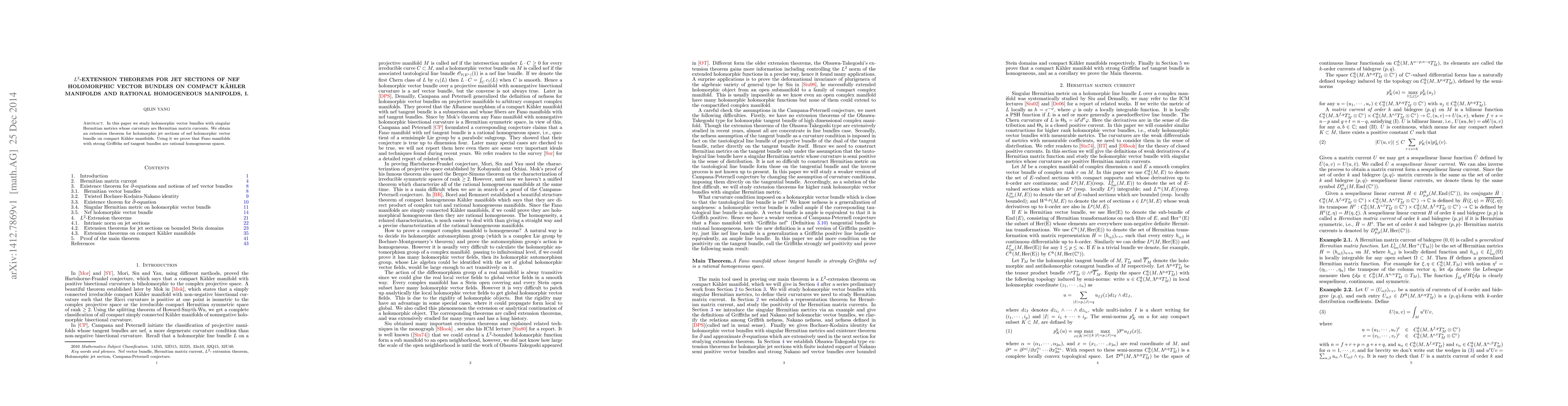 Summary: This paper extends holomorphic jet sections of nef vector bundles on compact Kähler manifolds, showing that Fano manifolds with strong Griffiths nef tangent bundles are rational homogeneous spaces. The approach involves studying vector bundles with singular Hermitian metrics whose curvatures are Hermitian matrix currents.