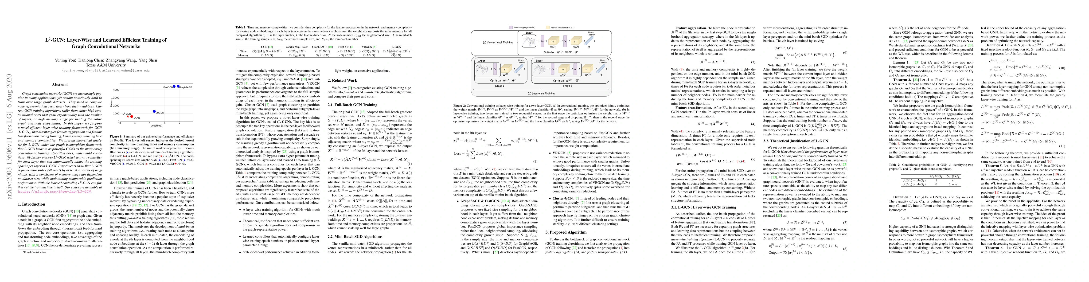 Graph convolution networks (GCN) are increasingly popular in many applications, yet remain notoriously hard to train over large graph datasets. They need to compute node representations recursively from their neighbors. Current GCN training algorithms suffer from either high computational costs that grow exponentially with the number of layers, or high memory usage for loading the entire graph and node embeddings. In this paper, we propose a novel efficient layer-wise training framework for GCN (L-GCN), that disentangles feature aggregation and feature transformation during training, hence greatly reducing time and memory complexities. We present theoretical analysis for L-GCN under the graph isomorphism framework, that L-GCN leads to as powerful GCNs as the more costly conventional training algorithm does, under mild conditions. We further propose L$^2$-GCN, which learns a controller for each layer that can automatically adjust the training epochs per layer in L-GCN. Experiments show that L-GCN is faster than state-of-the-arts by at least an order of magnitude, with a consistent of memory usage not dependent on dataset size, while maintaining comparable prediction performance. With the learned controller, L$^2$-GCN can further cut the training time in half. Our codes are available at https://github.com/Shen-Lab/L2-GCN.