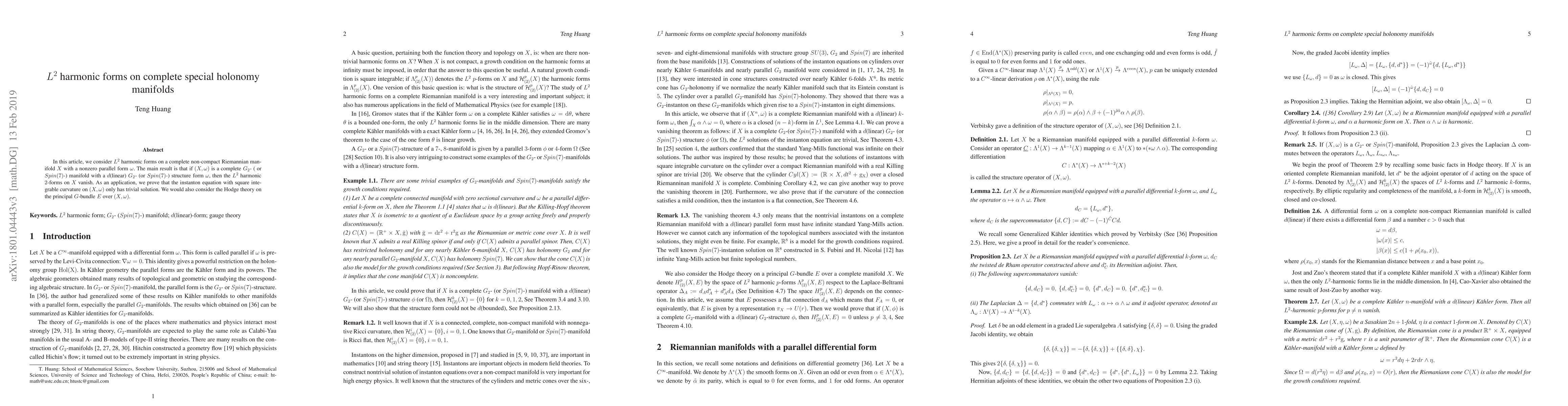 In this article, we consider $L^{2}$ harmonic forms on a complete non-compact Riemannian manifold $X$ with a nonzero parallel form $\omega$. The main result is that if $(X,\omega)$ is a complete $G_{2}$- ( or $Spin(7)$-) manifold with a $d$(linear) $G_{2}$- (or $Spin(7)$-) structure form $\omega$, the $L^{2}$ harmonic $2$-forms on $X$ will be vanish. As an application, we prove that the instanton equation with square integrable curvature on $(X,\omega)$ only has trivial solution. We would also consider the Hodge theory on the principal $G$-bundle $E$ over $(X,\omega)$.