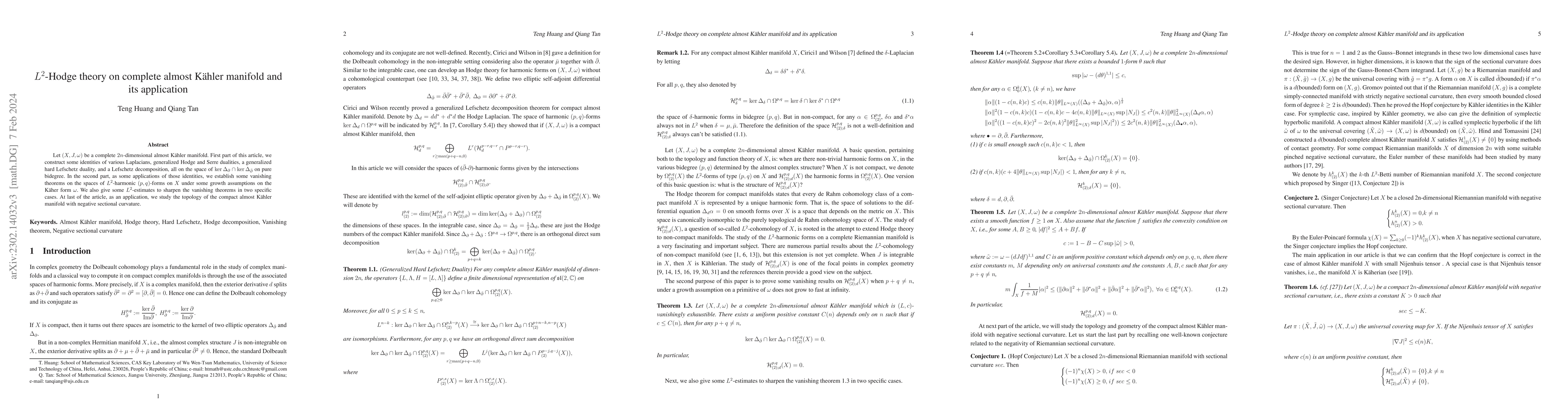 This paper constructs identities and dualities in $L^{2}$-Hodge theory on complete almost Kähler manifolds, establishing vanishing theorems for $L^{2}$-harmonic forms and $L^{2}$-estimates. It concludes with an application to the topology of compact almost Kähler manifolds with negative sectional curvature.