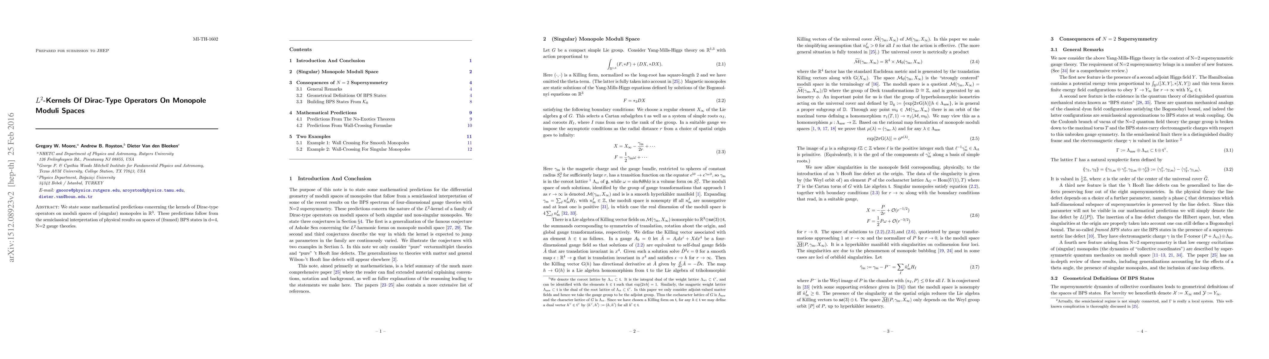 We state some mathematical predictions concerning the kernels of Dirac-type operators on moduli spaces of (singular) monopoles in R^3. These predictions follow from the semiclassical interpretation of physical results on spaces of (framed) BPS states in d=4, N=2 gauge theories.