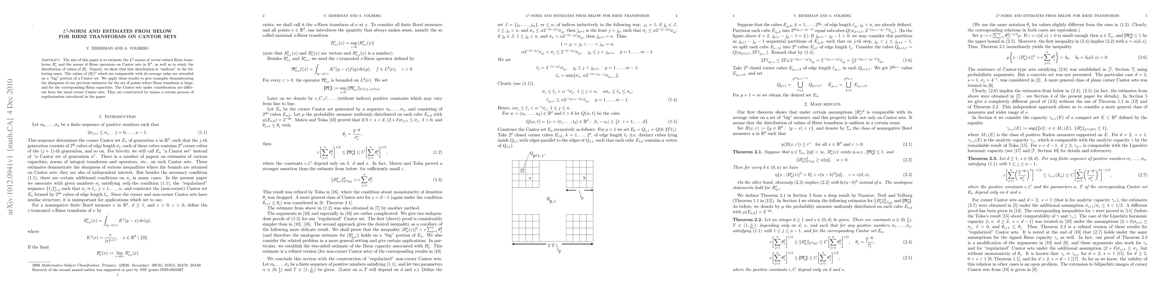The aim of this paper is to estimate the $L^2$-norms of vector-valued Riesz transforms $R_{\nu}^s$ and the norms of Riesz operators on Cantor sets in $\R^d$, as well as to study the distribution of values of $R_{\nu}^s$. Namely, we show that this distribution is "uniform" in the following sense. The values of $|R_{\nu}^s|^2$ which are comparable with its average value are attended on a "big" portion of a Cantor set. We apply these results to give examples demonstrating the sharpness of our previous estimates for the set of points where Riesz transform is large, and for the corresponding Riesz capacities. The Cantor sets under consideration are different from the usual corner Cantor sets. They are constructed by means a certain process of regularization introduced in the paper.